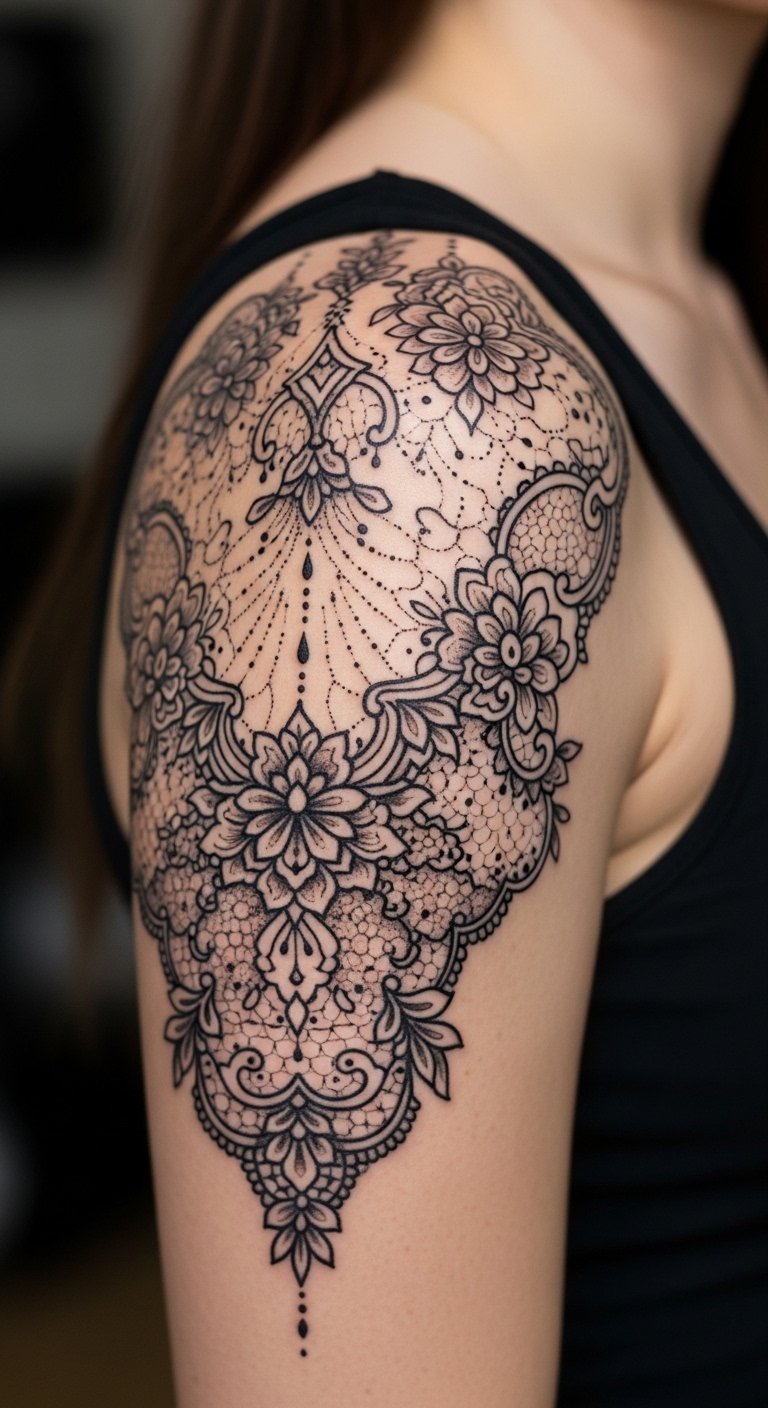 Emotionally, the lace conveys intimacy and self-expression, making it ideal for someone who wants a personal, tactile reminder of their identity. Delicate shading and negative space enhance the textile-like quality, while fine-line work preserves detail and allows the piece to age gracefully.