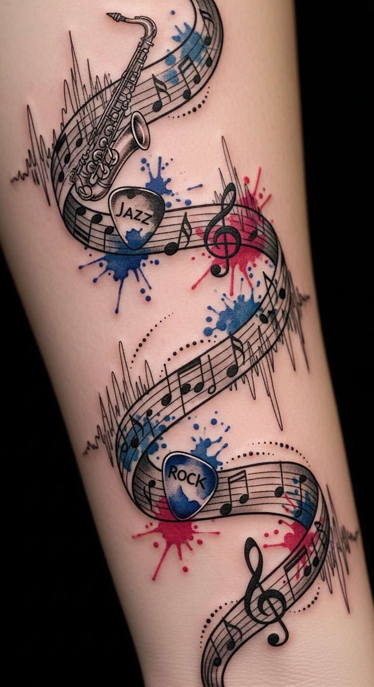 This design symbolizes harmony between genres and moments—notes as memory markers, waves as ongoing motion—evoking nostalgia, passion, and individuality; place it along the forearm or shoulder to allow the ribbon to wrap and move with the body’s natural lines for a dynamic, living composition.