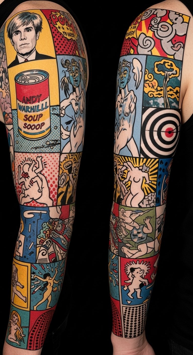 The design layers iconic Pop Art elements into a cohesive narrative on the arm or calf, symbolizing the movement’s celebration of mass culture, creativity, and rebellion; bold cans and comic panels evoke consumerism and mass media, targets and dots suggest focus and repetition, playful sculptures and stylized nudes introduce whimsy and sensuality, while radiant figures and mixed-media fragments convey energy and innovation.