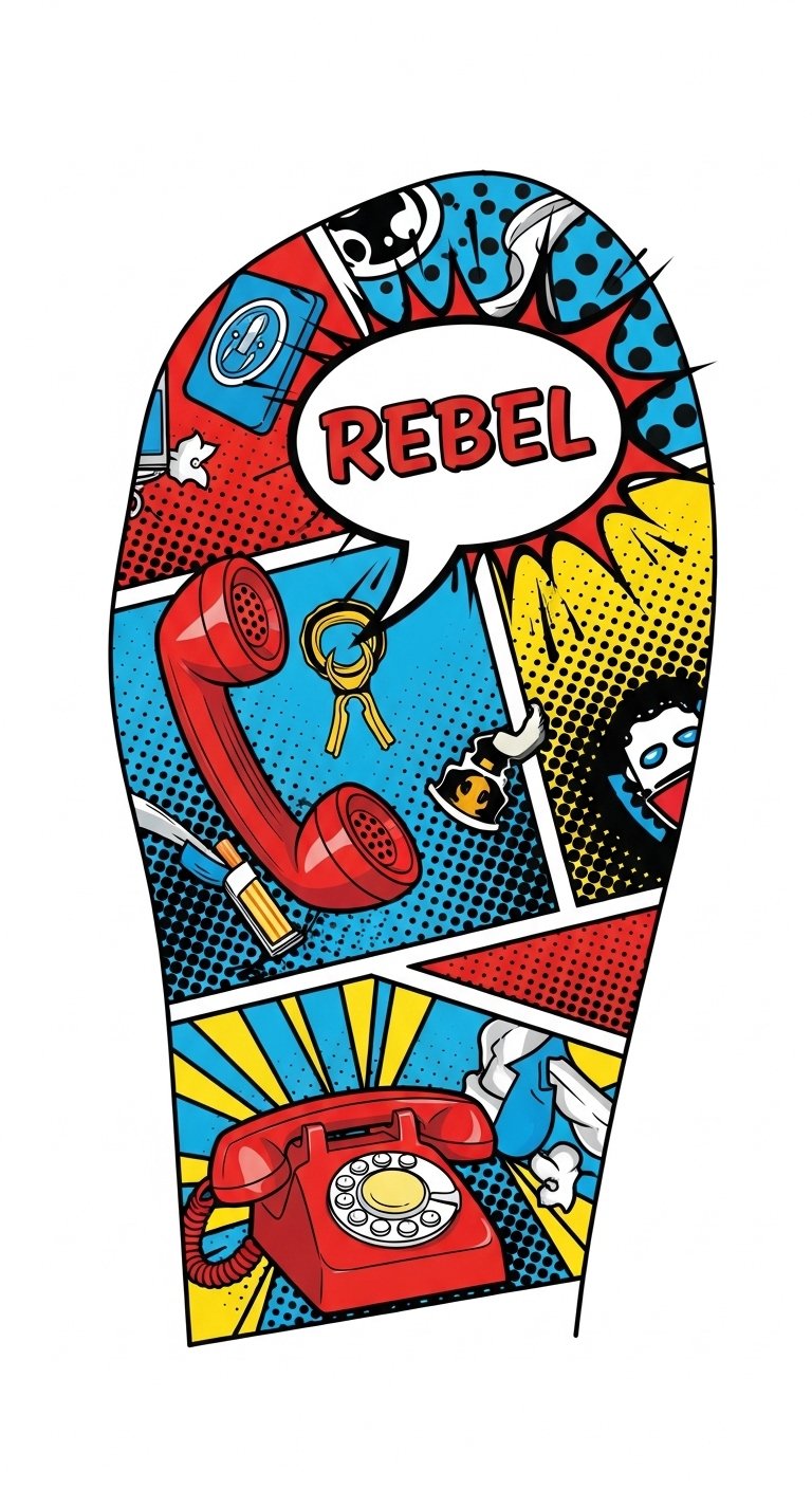 Let your imagination soar! The design concept combines a bold pop-art palette—primary reds, blues, and yellows—with heavy black outlines and halftone shading to evoke classic comic panels; central iconography (a stylized emblem or silhouetted figure mid-transformation) conveys resilience and personal ideals, while background elements like shattered panels or rising rays represent breaking limits and aspiration.