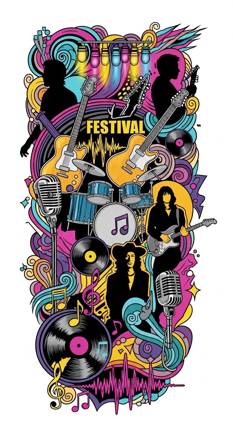 Designed as a flowing sleeve or chest piece, the elements in this image prompt translate into layered imagery: a central, slightly stylized artist portrait or instrument rendered in fine line and dotwork, framed by intertwining lyrical script that morphs into festival flags and rhythmic notation. Soundwaves ripple outward into abstract patterns and small band emblems, connecting past and present. Symbolically it celebrates memory, identity, and communal joy; emotionally it balances reverence with energetic celebration. Ideal placement follows the body’s contours—arm, shoulder-to-chest, or along the ribs—so the composition moves with breath and motion, enhancing the sense of music coming alive.