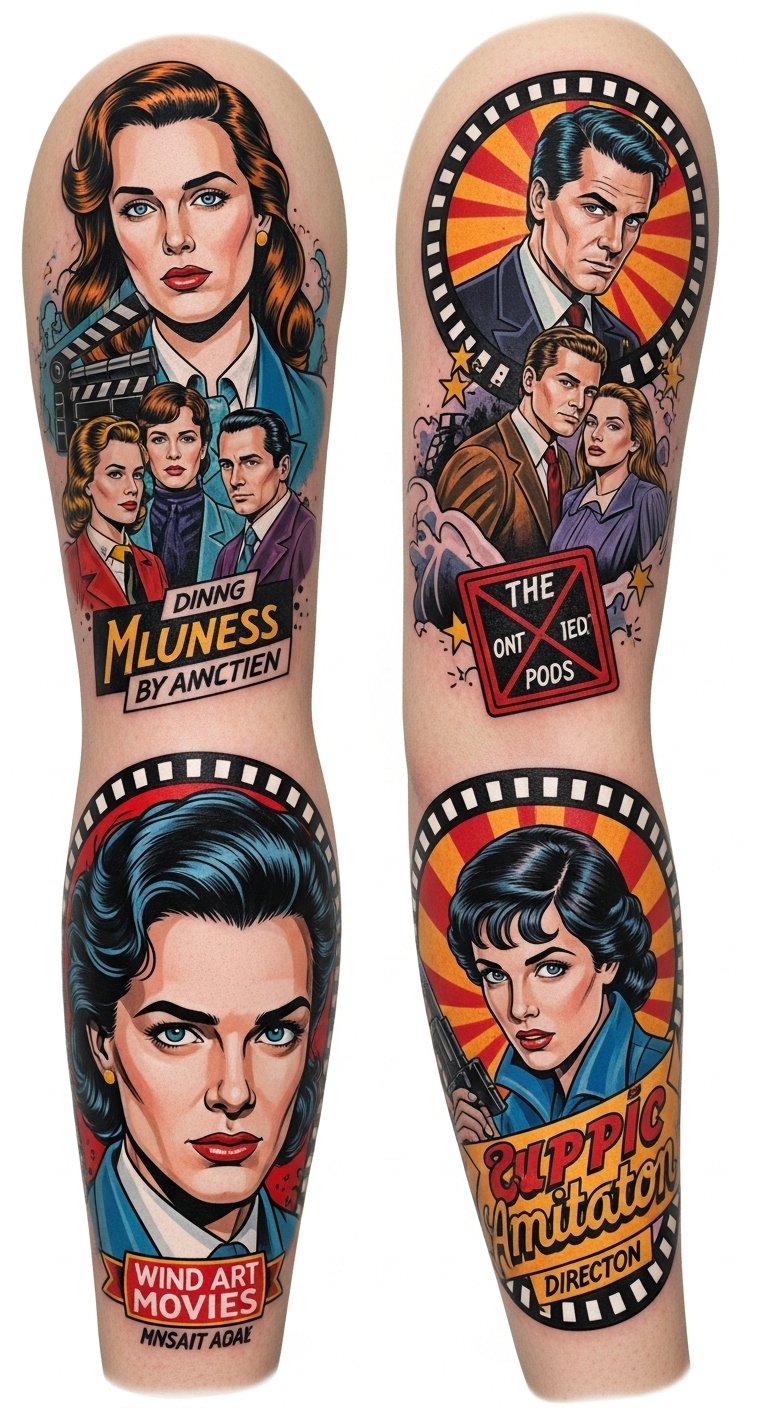 A sleeve design centered on a collage of bright, high-contrast panels featuring a stylized protagonist portrait, a dramatic scene recreation framed like a comic panel, and bold symbols (film reel, clapboard, ticket stub) connected by halftone patterns and neon color blocks; this concept symbolizes a lifelong devotion to storytelling and the emotional highs of cinema, mixing nostalgia (vintage elements) with rebellion (cult references) to evoke joy, wonder, and personal identity; ideal placement: full forearm or upper arm wrapping to allow the panels to read sequentially and interact with body movement.