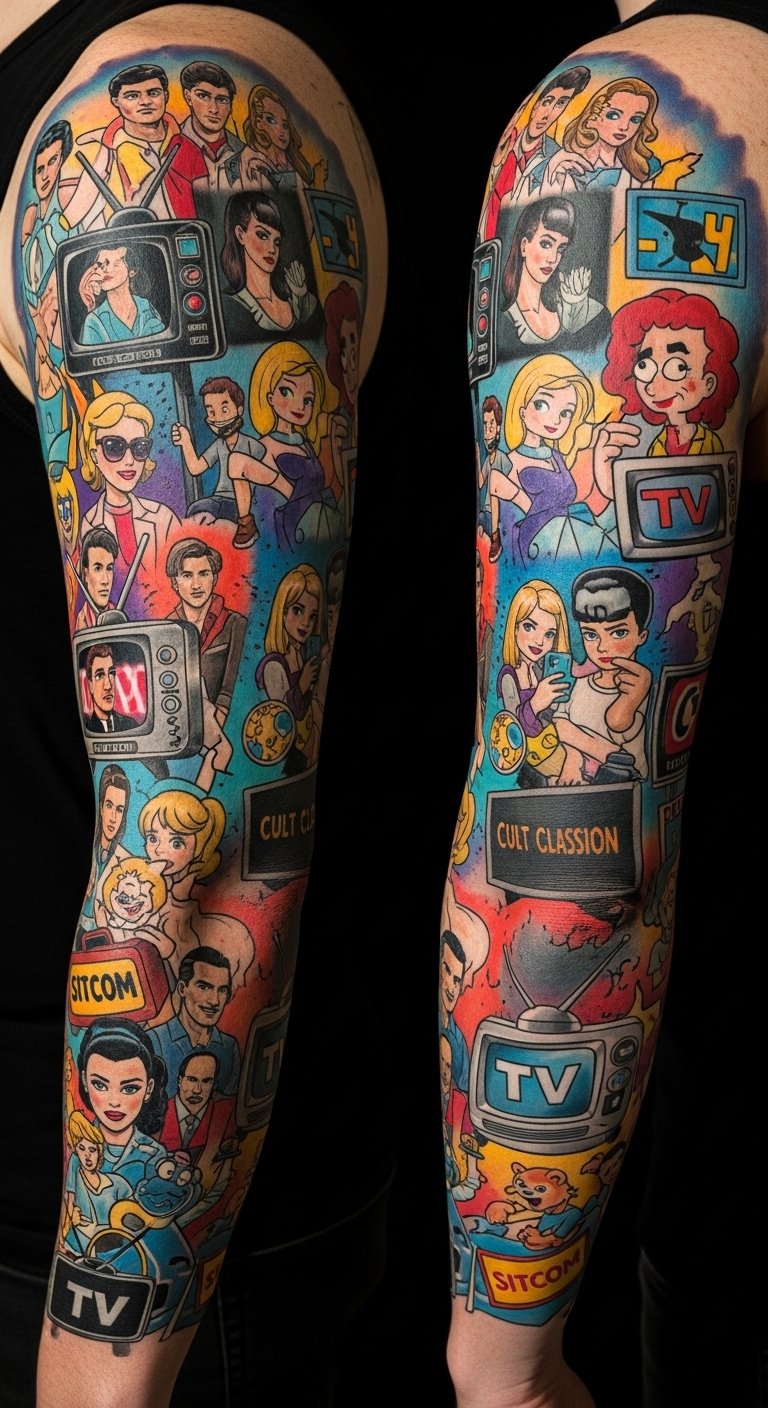 A vibrant upper-arm or calf piece blending stacked TV screens, neon speech bubbles, and halftone textures, using saturated primary colors and thick black outlines to echo pop art and classic TV graphic design; include a small retro antenna, a stylized sitcom laugh track waveform, and a merged silhouette of two iconic characters to represent fusion art; size adaptable for sleeve integration or standalone statement; crisp linework and selective dot shading for a lively, wearable homage that reads clearly from a distance.