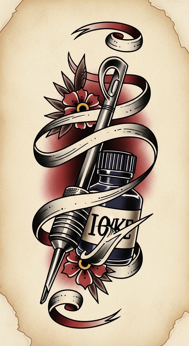 Let your creativity flow! This design symbolizes the craftsmanship and ritual of tattooing—the needle and ink bottle as tools of tradition, ribbon-like stencils representing guidance and technique, and floral accents honoring cultural roots.