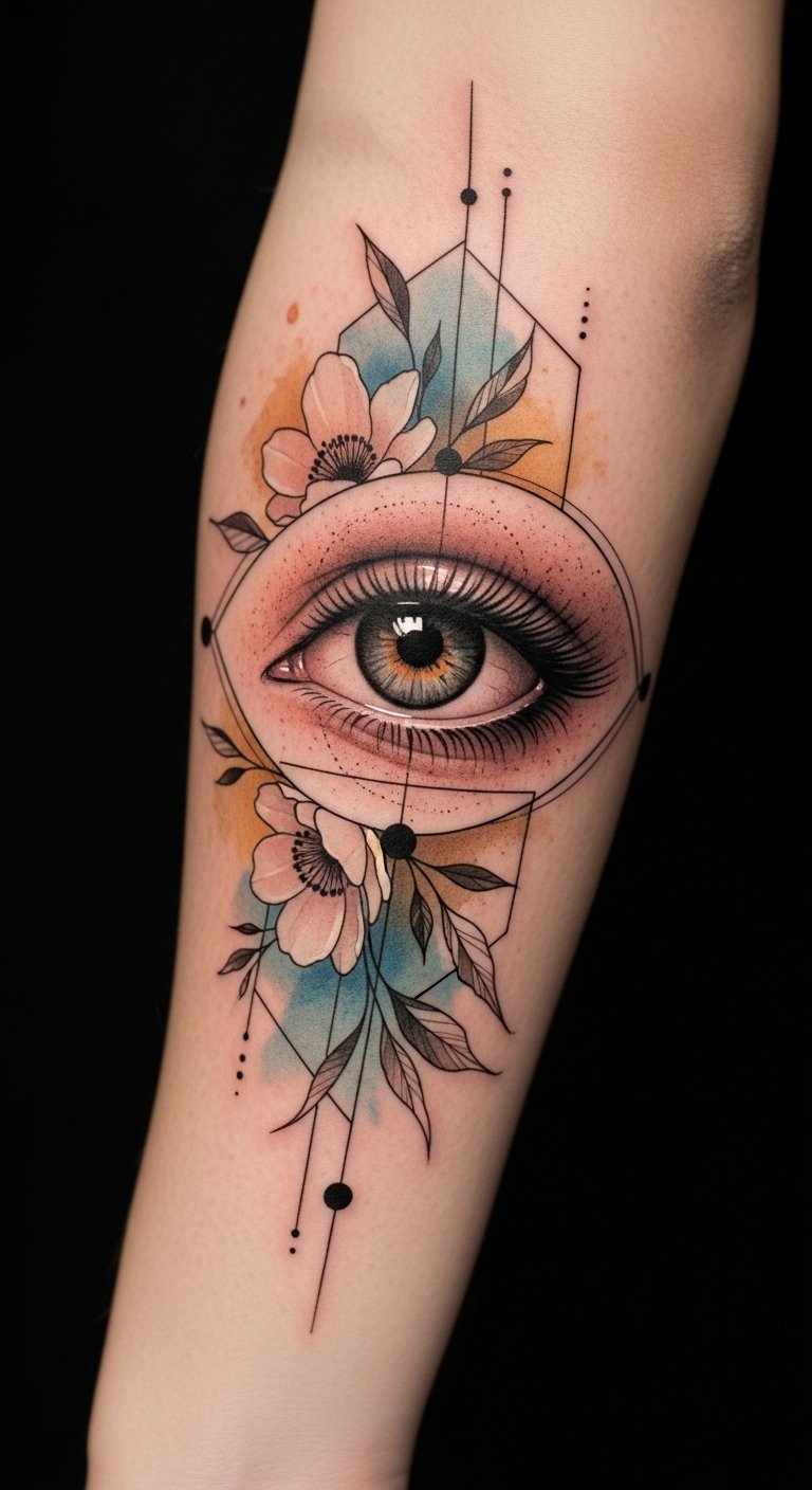 The concept blends vision and growth: the realistic eye symbolizes awareness and self-observation, while the surrounding watercolor florals represent emotional blooming and softening of rigid identity.