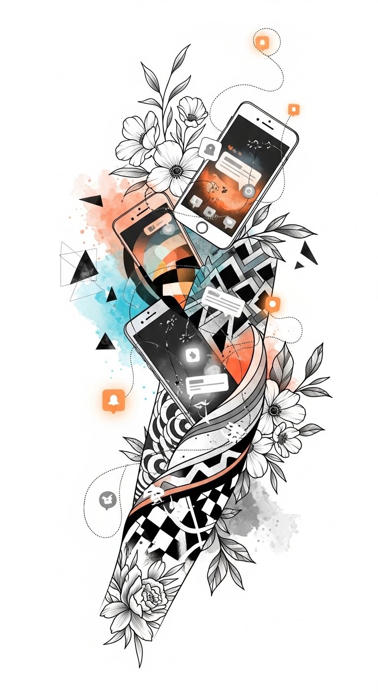 The smartphone and notification motifs convey connection and discovery, watercolor splashes evoke emotional expression, and the chain-like links suggest community and shared creativity—place it where it can be easily shown to celebrate openness and to spark conversation.