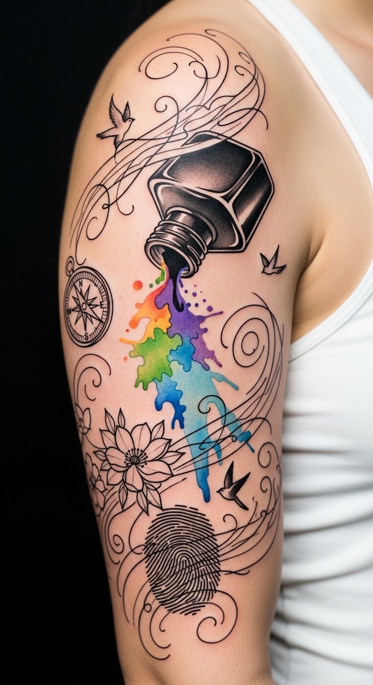 Despite evolving societal perceptions, this art form empowers you to break free, boldly showcasing your individuality in a world that often seeks conformity. The design symbolizes creative liberation (the spilling ink), personal direction and growth (compass and blooming flower), uniqueness (abstract fingerprint), and freedom (birds); emotion is hopeful, confident, and introspective.