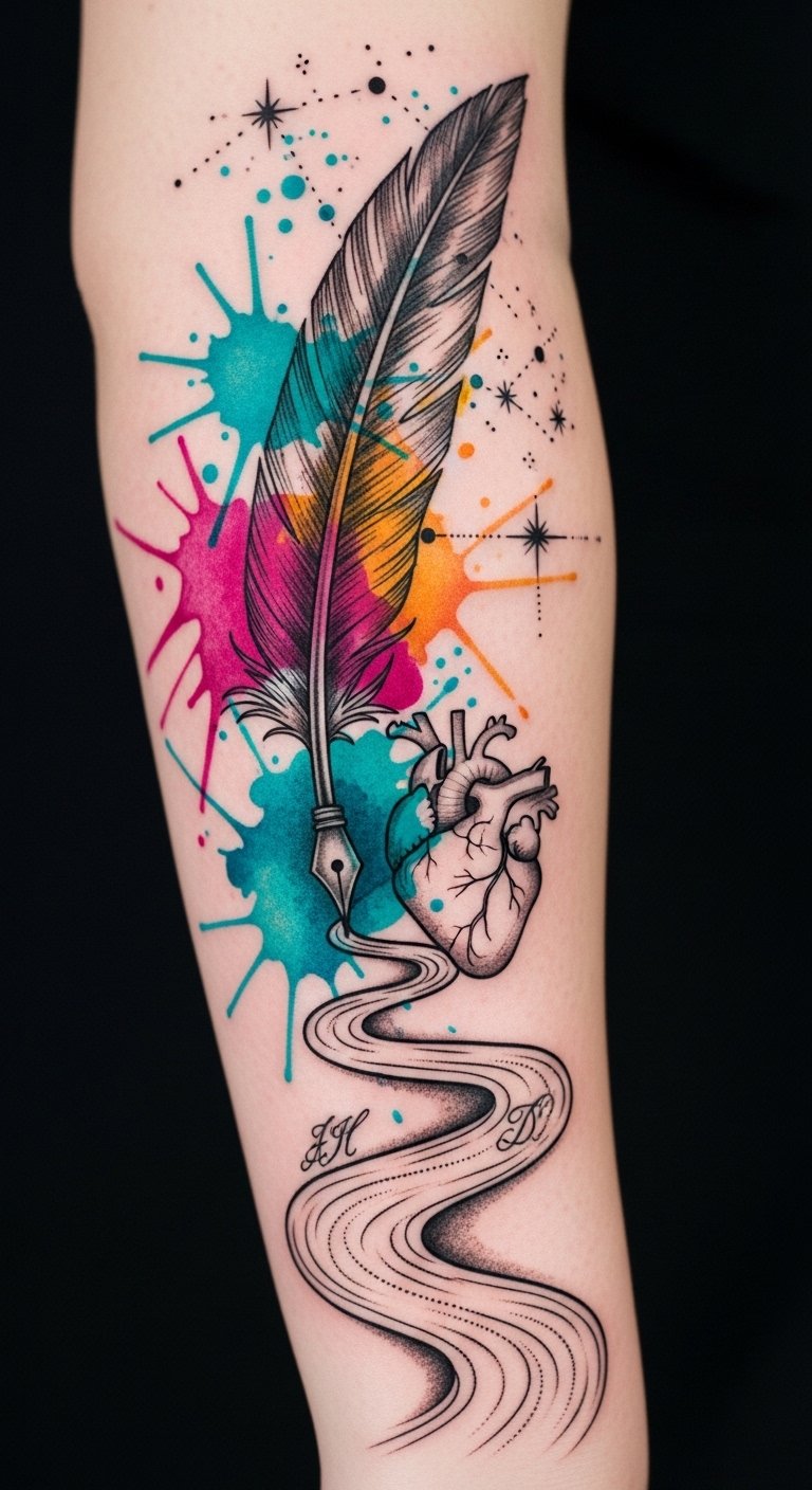 Each tattoo reflects who you are, empowering you to embrace your individuality and boldly communicate your journey with every glance. The design uses the quill-to-river transition to symbolize storytelling and life’s flow, watercolor splashes for emotional highs and lows, the heart for core personal truth, and the constellation for guidance and continuity.