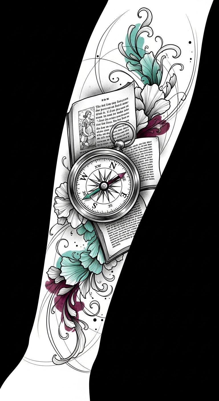 The design symbolizes personal navigation (compass) through knowledge and narrative (open book), with ink-floral blooms representing growth and the transformative nature of self-expression; geometric lines tie past conventions to contemporary aesthetics.