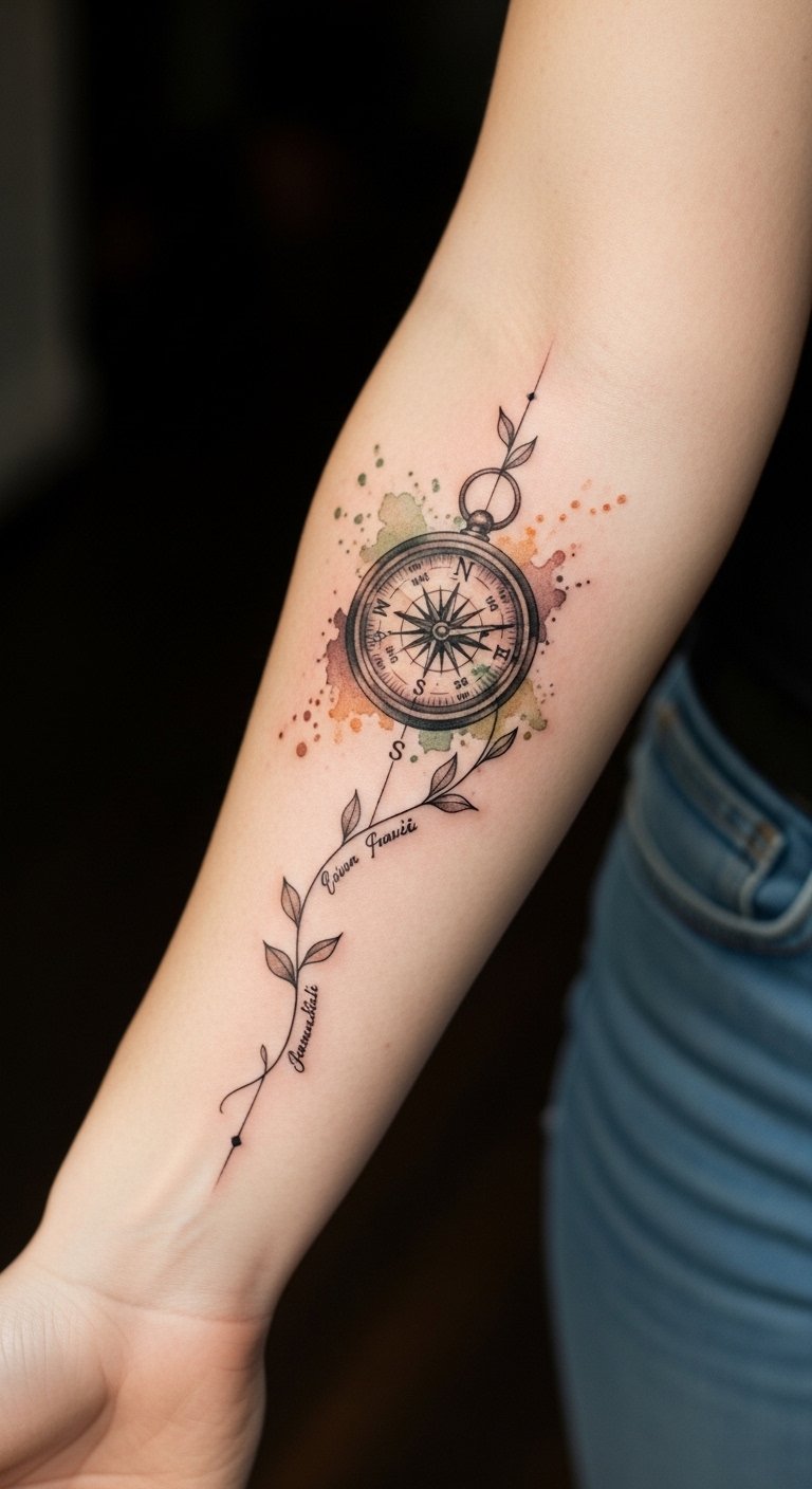 Incorporate the original passage as fine-script text winding with the vine from compass to wrist, symbolizing journey, resilience, and continuity between generations; the compass represents guidance through life stages, the vine signals growth and reclaiming the body, watercolor tones convey warmth and nostalgia, and the faded look honors age and experience.