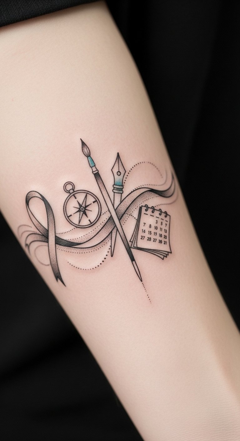 The ribbon represents the continuous journey of self-discovery, the compass anchors intention and direction, the paintbrush honors artistic impulses, and the calendar page marks a pivotal memory; together they convey movement, choice, and memory.
