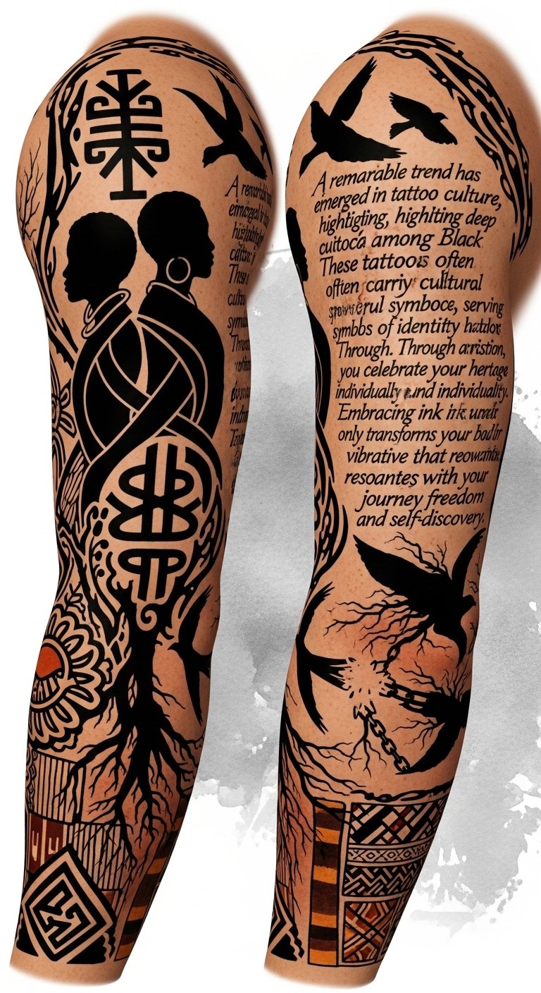 This design uses the quoted text as a literal ribbon of words wrapping around the forearm or calf, integrating it with ancestral silhouettes, Adinkra icons, kente motifs, roots and birds to symbolize lineage, resilience, cultural pride, and liberation. The emotional tone is reverent and empowering; placement on the sleeve or calf allows the narrative to unfold visually as the wearer moves, connecting personal history to community and the journey toward freedom.