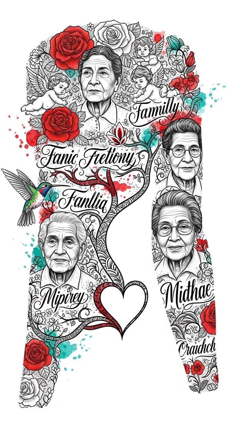 This design blends familial lineage and personal expression: roses and folkloric motifs represent heritage and resilience; the hummingbird symbolizes joy and perseverance; family names in cursive tie generations together, while cherub figures nod to protection and memory.