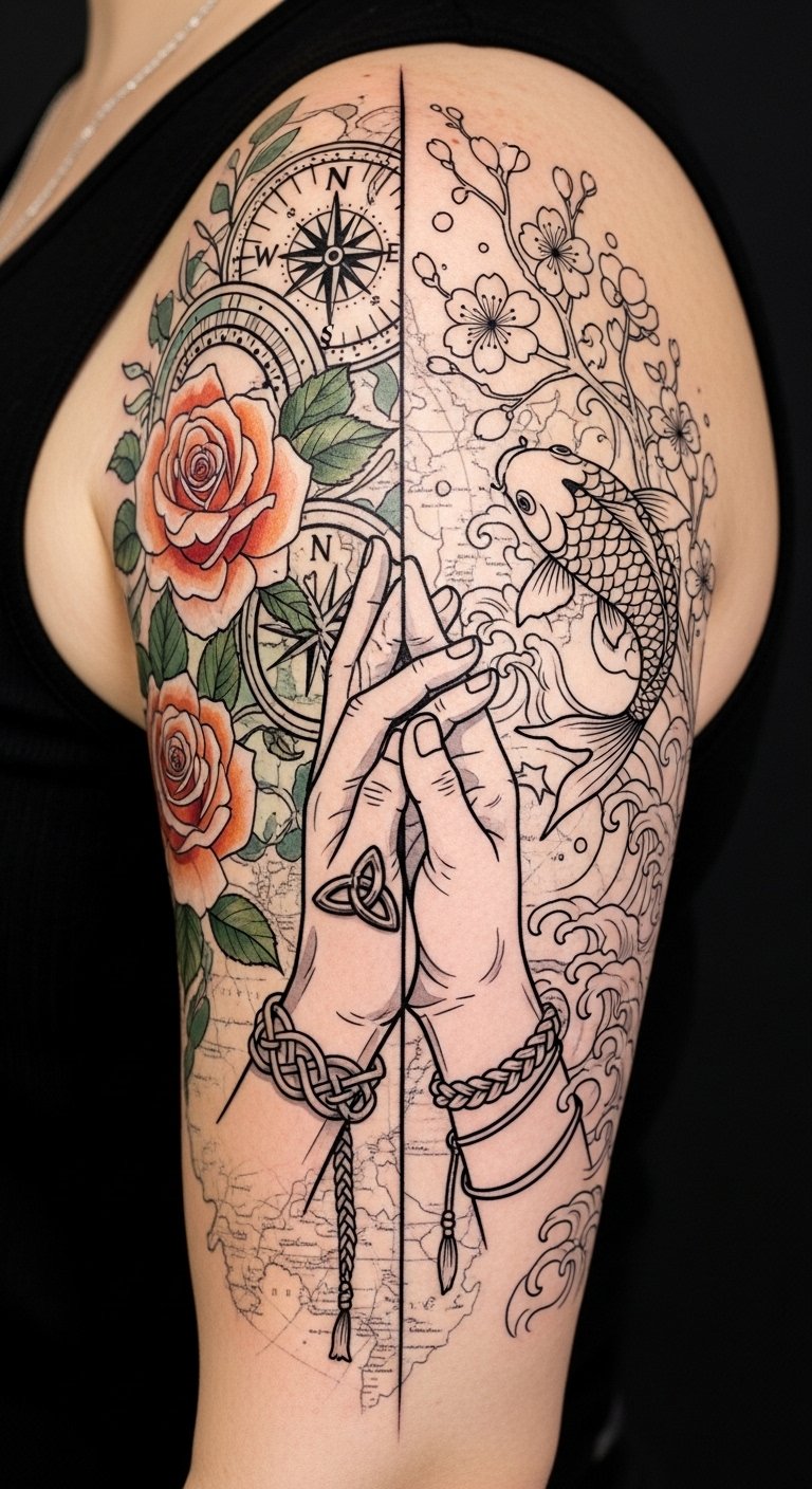 This design embodies the interplay between personal expression and cultural heritage described in the text: the roses and compass reflect individuality and journey common in Western traditions, while the cherry blossoms, koi, and waves honor East Asian aesthetics and familial expectations. The overlapping hands at the center symbolize connection, balance, and the choice to blend tradition with freedom. Placed on the upper arm or shoulder, the piece can be shown or covered as desired, offering an intimate yet visible statement that carries emotional depth and room for personalization.
