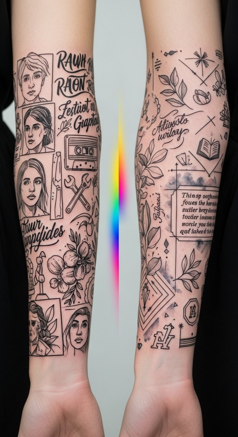 This growing acceptance encourages everyone to explore their unique narratives on skin. The design symbolizes unity amid diversity, evoking pride, resilience, and connection; it aims to stir emotion through familiar motifs placed across the upper arm or full sleeve where movement animates each cultural element, allowing personal storytelling and communal visibility.