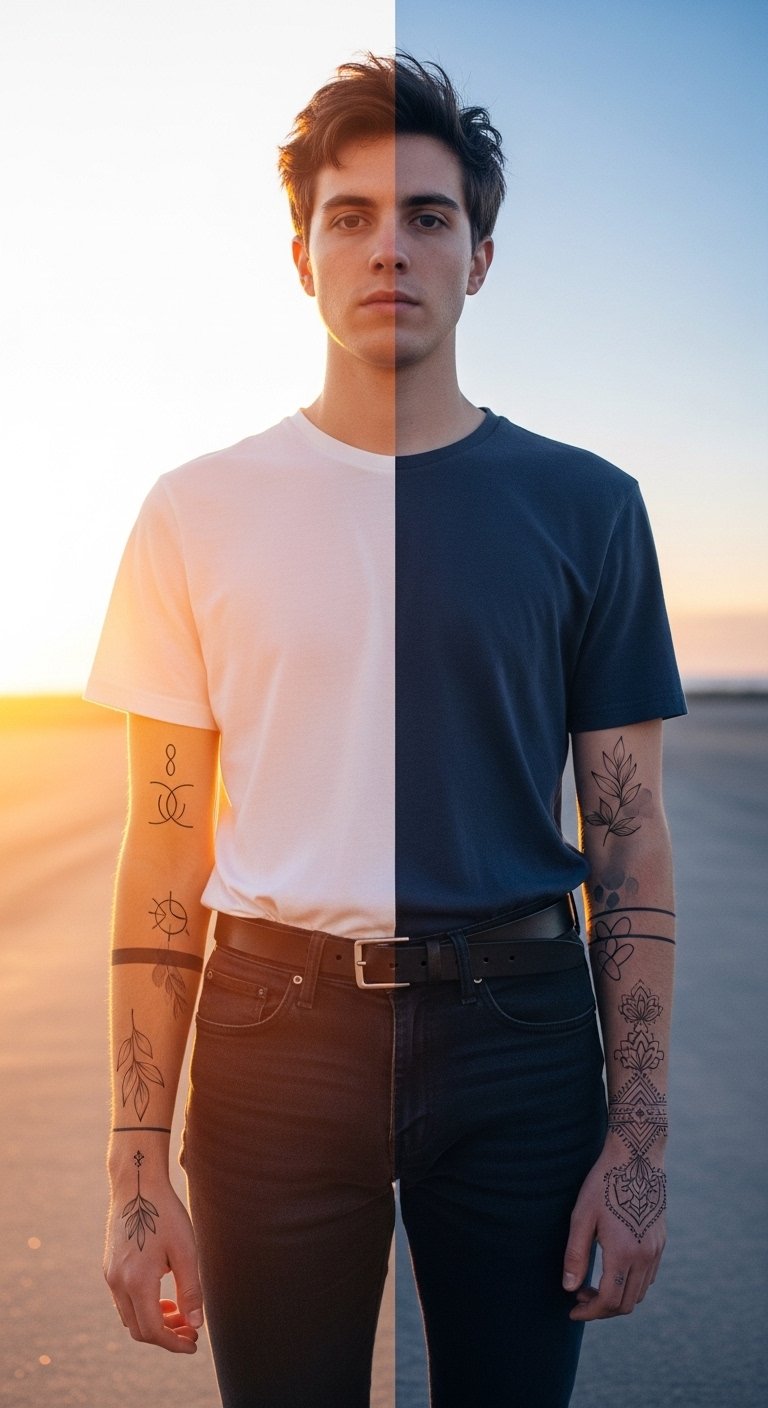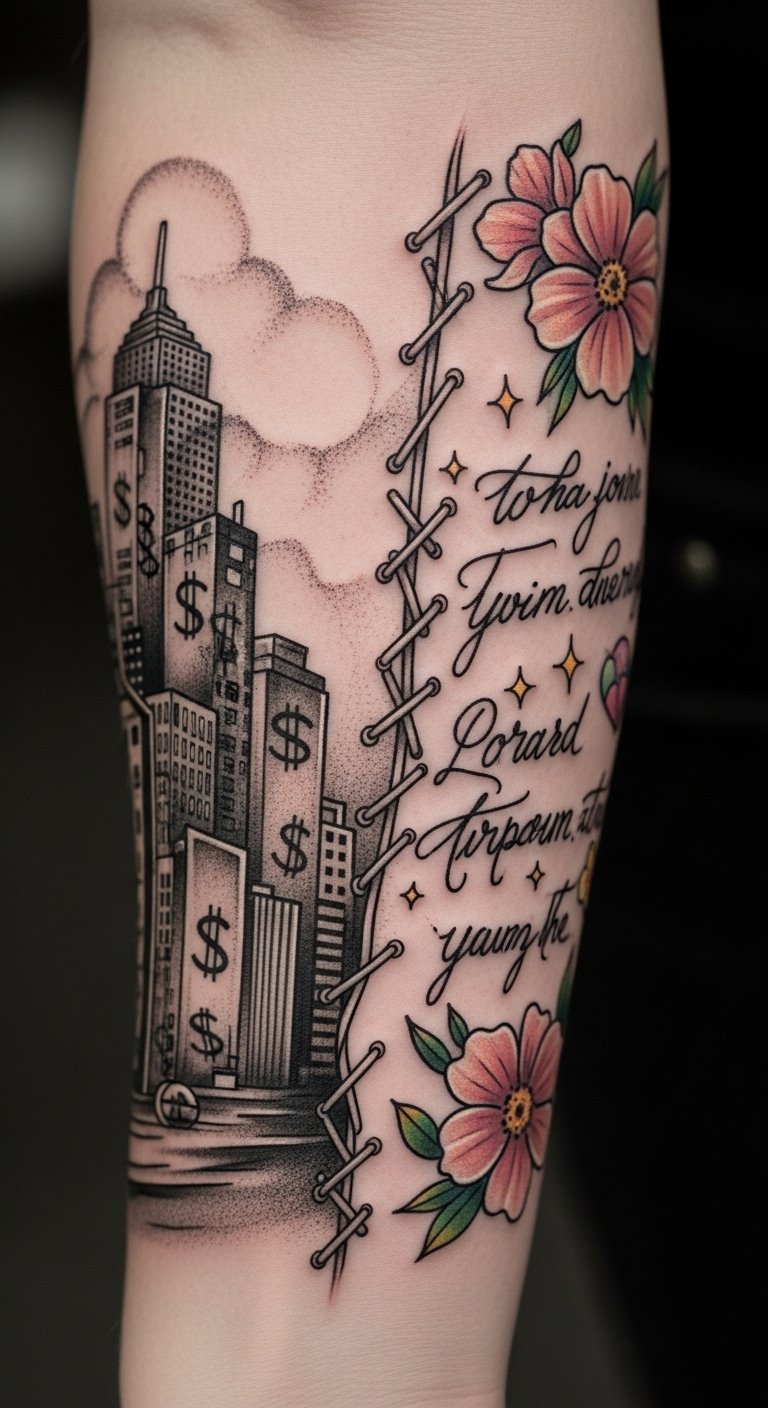 How does your education shape your tattoo choices? Your educational impact can guide your ink journey, influencing not just designs but meanings, too. Those with less formal education often embrace tattoos as expressions of identity, while graduates may opt for more refined art. Regardless of background, each choice reflects your unique story, intertwining knowledge and self-expression in a vibrant tapestry of inked freedom. The left-side imagery symbolizes raw, lived experience and personal identity—bold, immediate, and tactile—evoking resilience and belonging; the right-side speaks to refinement, study, and introspection—delicate lines conveying thoughtfulness and aspiration. Placed along the forearm so each half faces different observers, the seam at the center represents the continual blending of lived learning and formal education, carrying emotional weight of pride, memory, and personal growth.