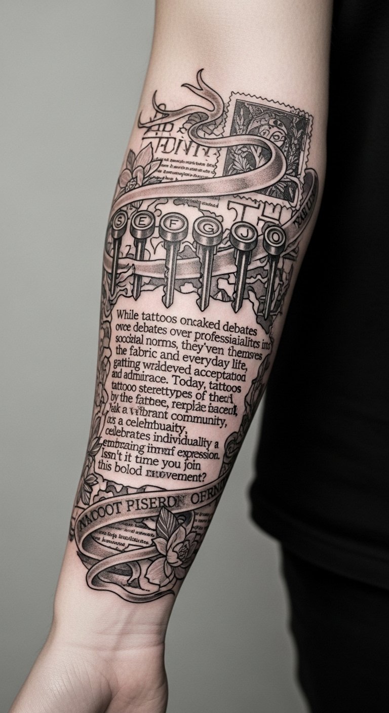 This design symbolizes a personal narrative unfolding—an open book representing life stories that seamlessly becomes a ribbon and quill, signifying writing one’s own chapters, then evolving into a tattoo machine to mark the act of choosing permanent self-expression. The tiny star-like ink droplets evoke milestones and moments of courage. Emotionally it balances thoughtfulness and boldness, suitable for someone honoring a meaningful decision. Ideal placements are the inner forearm for visibility and daily reminder, or the ribcage for a more intimate, milestone-focused piece; linework and dot shading emphasize delicacy while the machine motif adds strength.