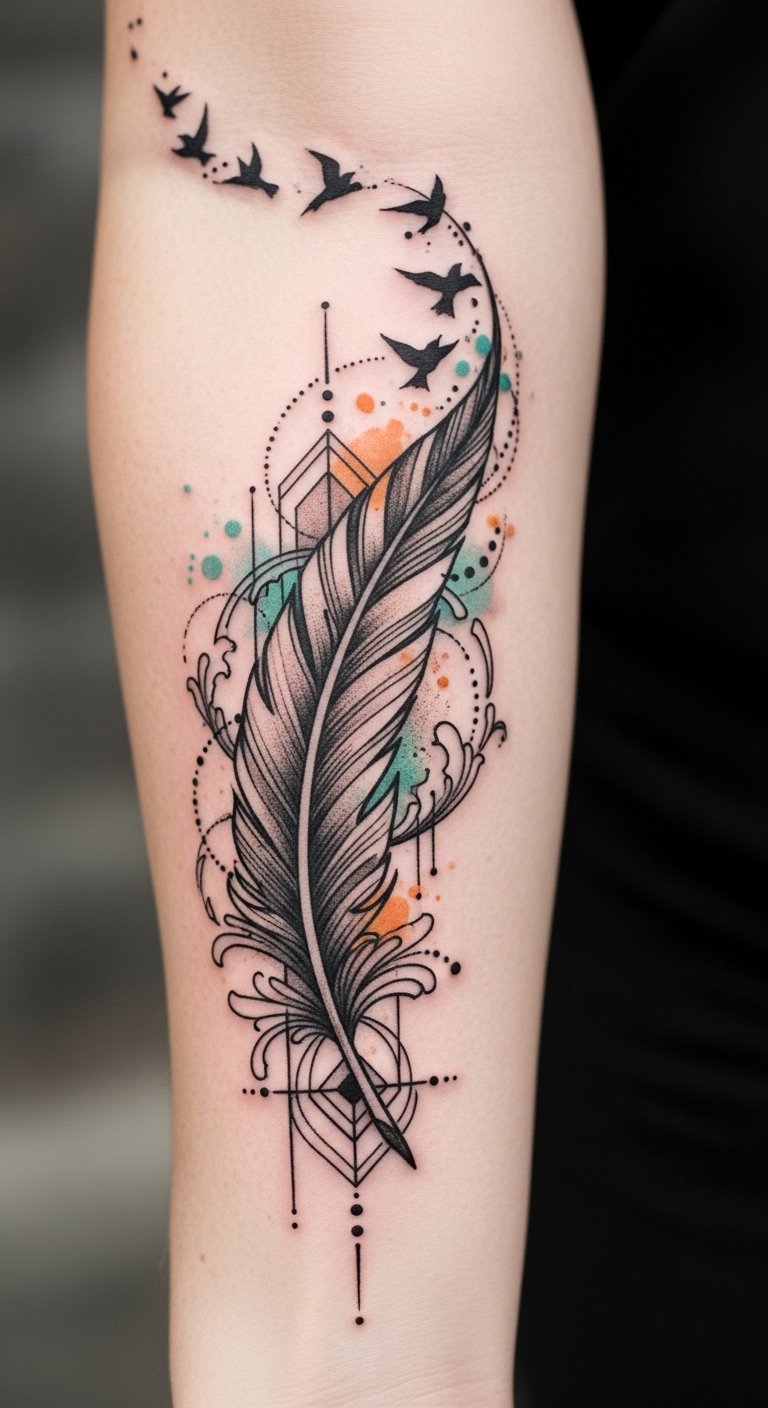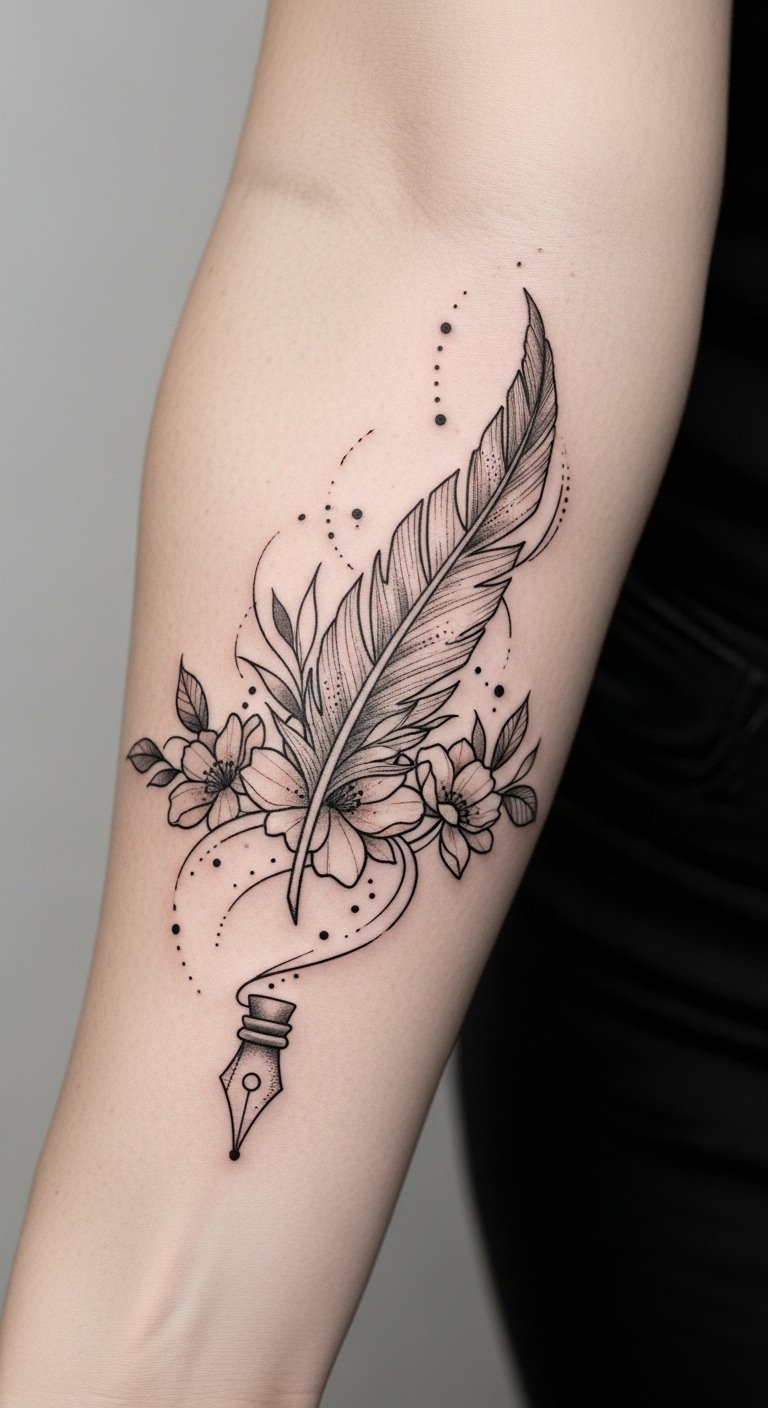 Embracing tattoos lets you express freedom, making your body a canvas of artistry that captivates others. This design symbolizes transformation and self-expression—the quill representing creativity and personal narrative, the birds embodying liberation and the spreading of one’s story.
