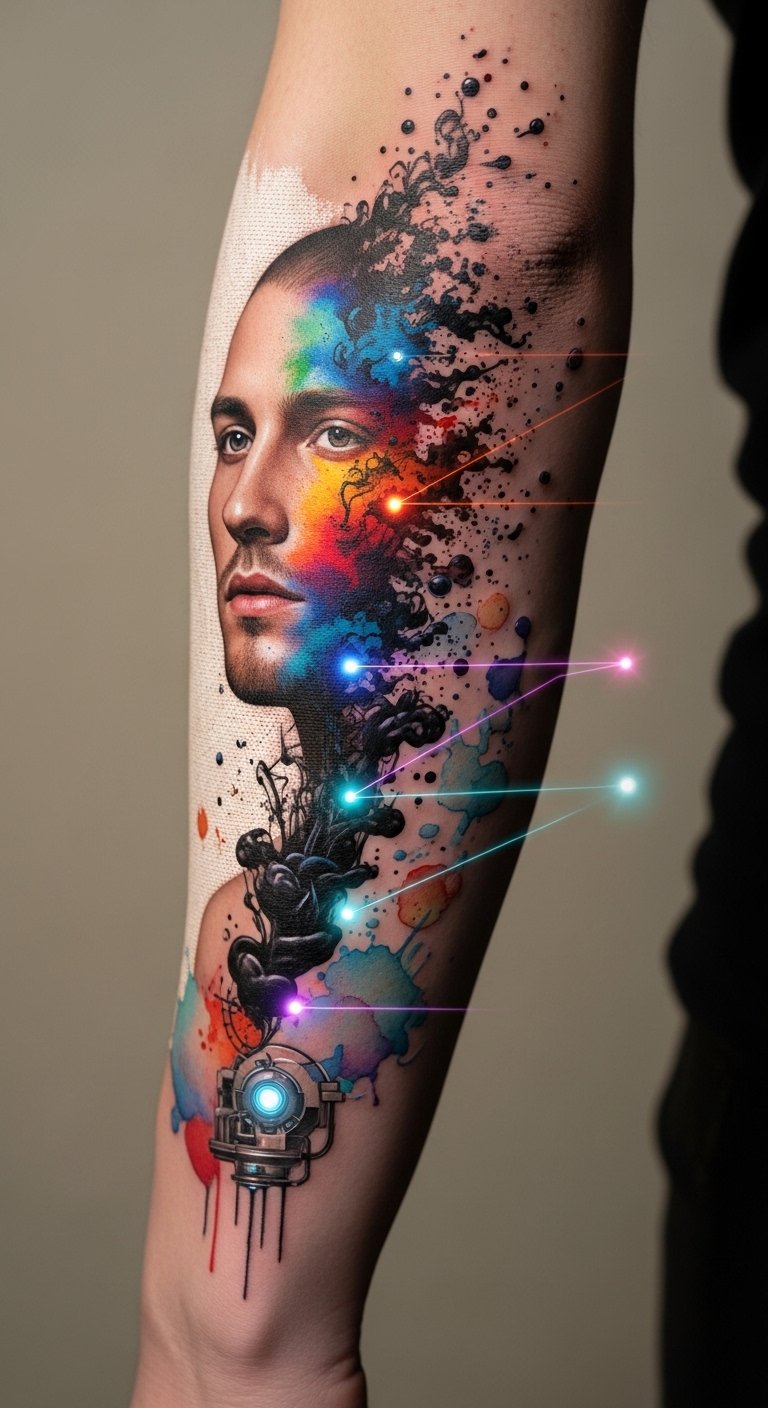 This design uses the original text as its literal concept: the painted human canvas represents personal expression and tattoo acceptance, while the dissolving ink and laser-like beams symbolize removal technology enabling change and fresh starts.