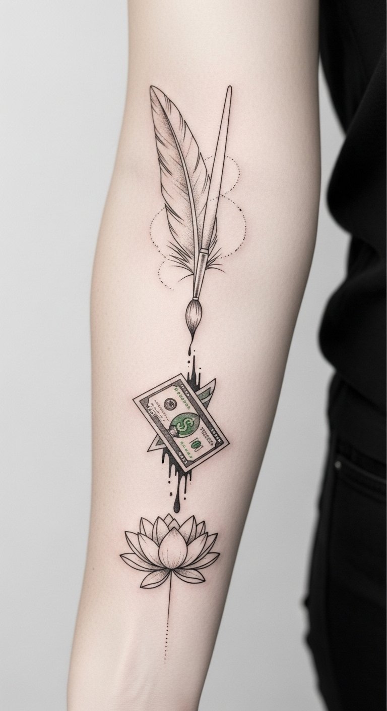 Embrace the journey, and let your ink tell your story! The design symbolizes the balance between creativity and cost: the quill and brush represent artistic expression, the dollar fold acknowledges practical budgeting, and the lotus signifies growth and value emerging from thoughtful investment.