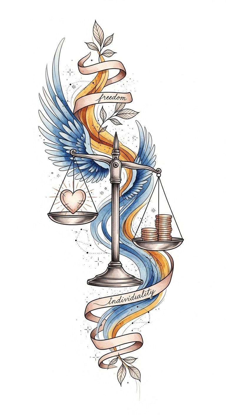 When considering a tattoo, it’s essential to weigh the emotional and aesthetic value against the financial commitment. Your tattoo investment analysis should include not just the upfront cost but the lasting joy and self-expression it brings. Shift your cost perception; a well-chosen tattoo can be priceless, representing freedom and individuality. In the end, it’s about valuing what resonates with your soul. This design uses the scale to symbolize deliberate choice—balancing monetary cost (coin stack) and emotional worth (radiant heart)—while the wings and ribbons evoke liberation and personal identity; the watercolor tones convey tenderness and permanence, dotwork and constellations add intimacy and continuity. Ideal placement is the forearm wrap for visibility and flow or the chest for closeness to the heart, allowing the composition’s movement to follow natural musculature and emphasize the theme of personal valuation.