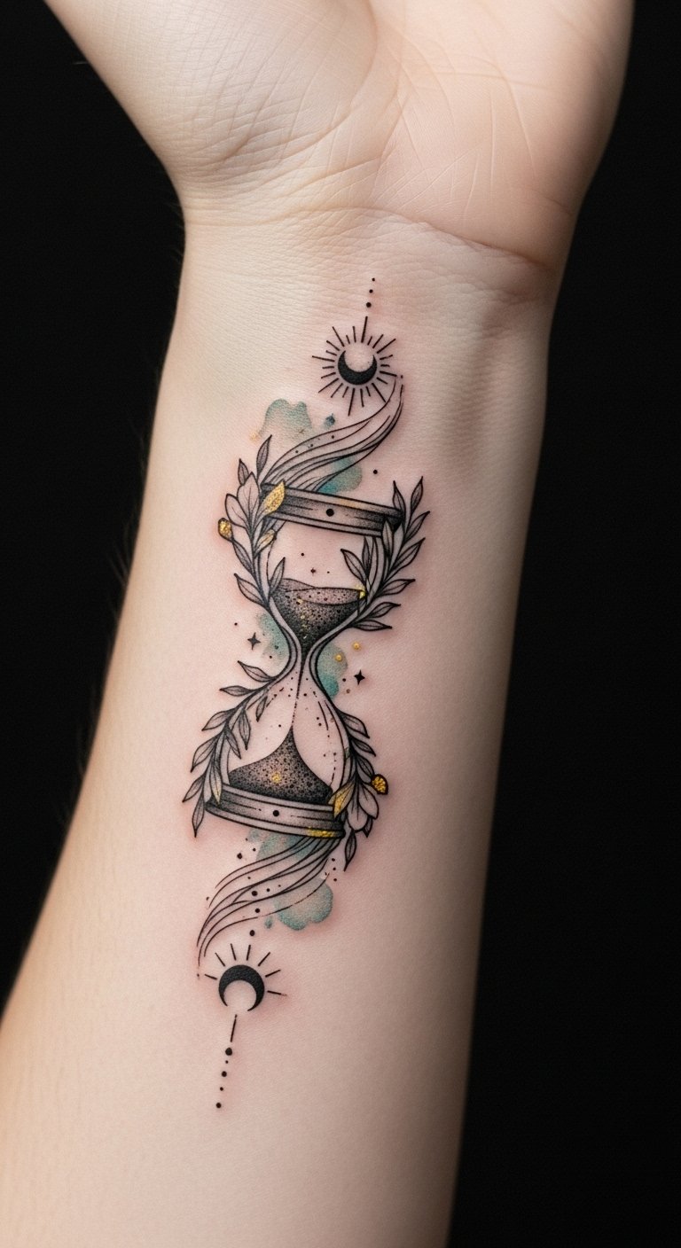 The hourglass symbolizes time and the concern for a tattoo’s longevity, while the ink transforming into plants represents growth and the life a design can carry. Sun and moon motifs indicate the cycle of day and night—permanence amid change—and the watercolor fades evoke both aging and gentle maintenance. Emotionally the piece balances nostalgia and reassurance: it acknowledges worry about fading but celebrates the ability to preserve meaning through care. Inner forearm placement keeps the design visible for daily reminders yet allows easy protection during healing and touch-ups.