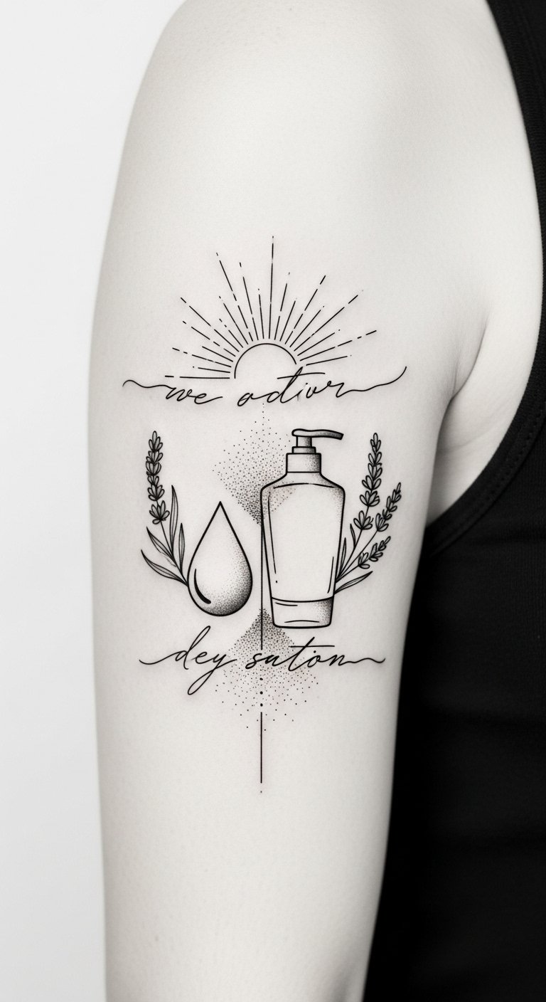 This design symbolizes protection and preservation—the water droplet and lotion bottle represent care and nourishment, the sun denotes exposure and the need for defense, while lavender adds calm and healing.