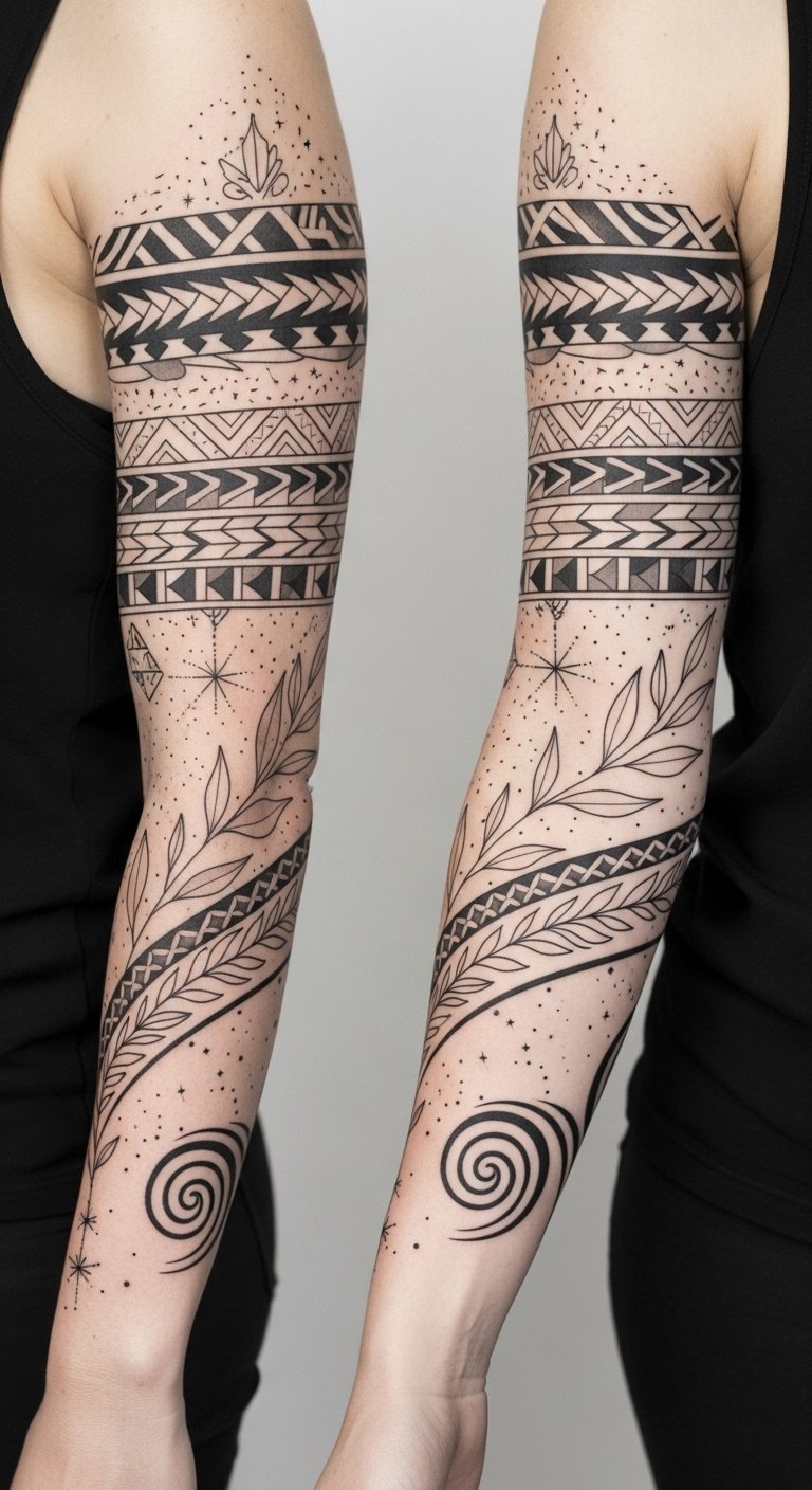 From tribal designs to modern minimalism, every tattoo tells a story, allowing you to express your individuality while connecting with a rich, evolving tradition. This sleeve concept symbolizes continuity and personal growth: the bold geometric bands represent ancestral strength and heritage, the transition to delicate botanicals and constellations evokes personal evolution, dreams, and connection to nature and the cosmos.