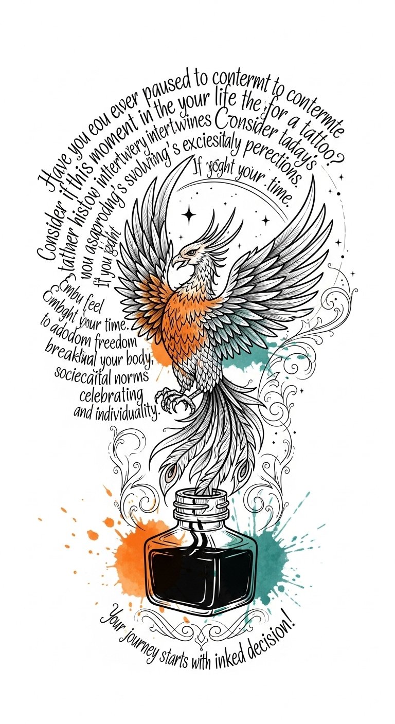The design pairs the literal, unaltered text with a phoenix emerging from an ink bottle to symbolize rebirth through self-expression and the permanence of choices; watercolor splashes convey emotion and the evolving nature of societal perception, while vintage filigree nods to tattoo history.