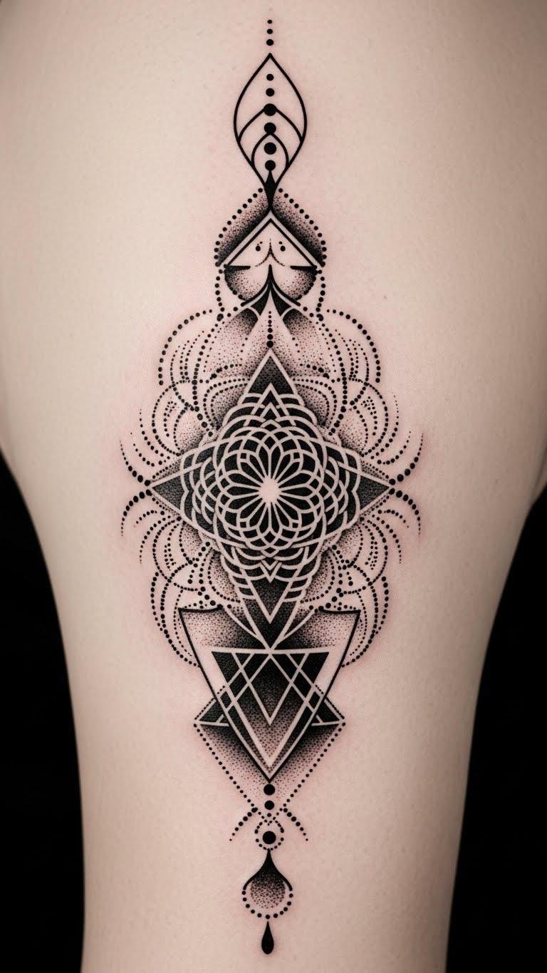 Dotwork and geometric elements in this design concept symbolize the interconnectedness of personal history and inner order: concentric mandalas rendered in fine stippling represent cycles of growth, while interlocking polygons provide a sense of structure and balance.