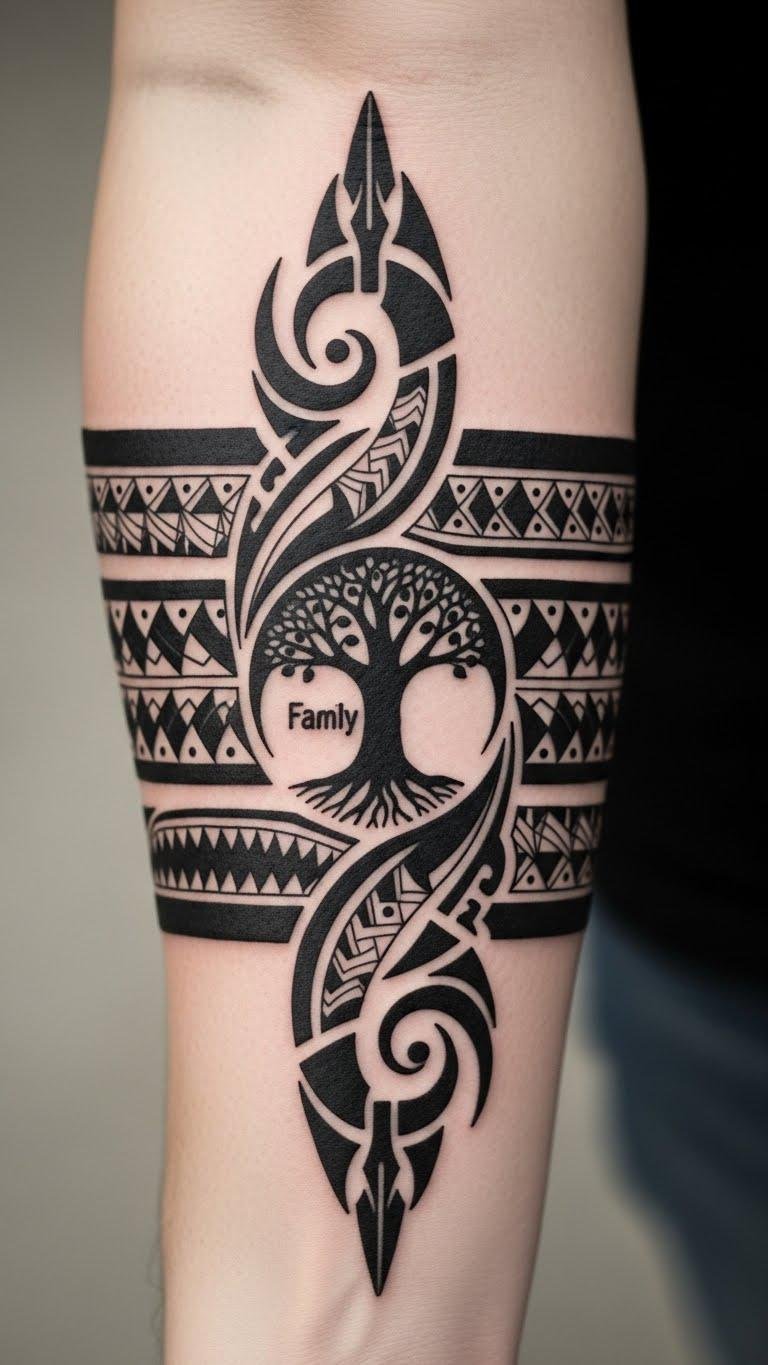 Embrace this art form to celebrate your roots and personal journey. The design combines protective shark teeth and spearheads for strength, koru spirals for renewal and growth, and a hidden family-tree silhouette in negative space to honor lineage; emotionally it conveys resilience, belonging, and reverence for ancestors.