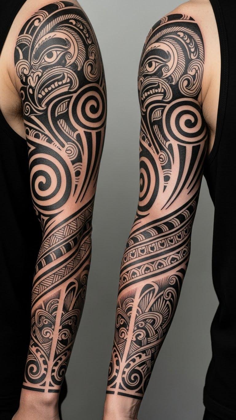 A full-sleeve design that weaves ancestral storylines into the arm’s natural flow: koru spirals for new life and growth, the manaia as protector near the shoulder, and whakapapa lines tracing lineage down toward the hand.
