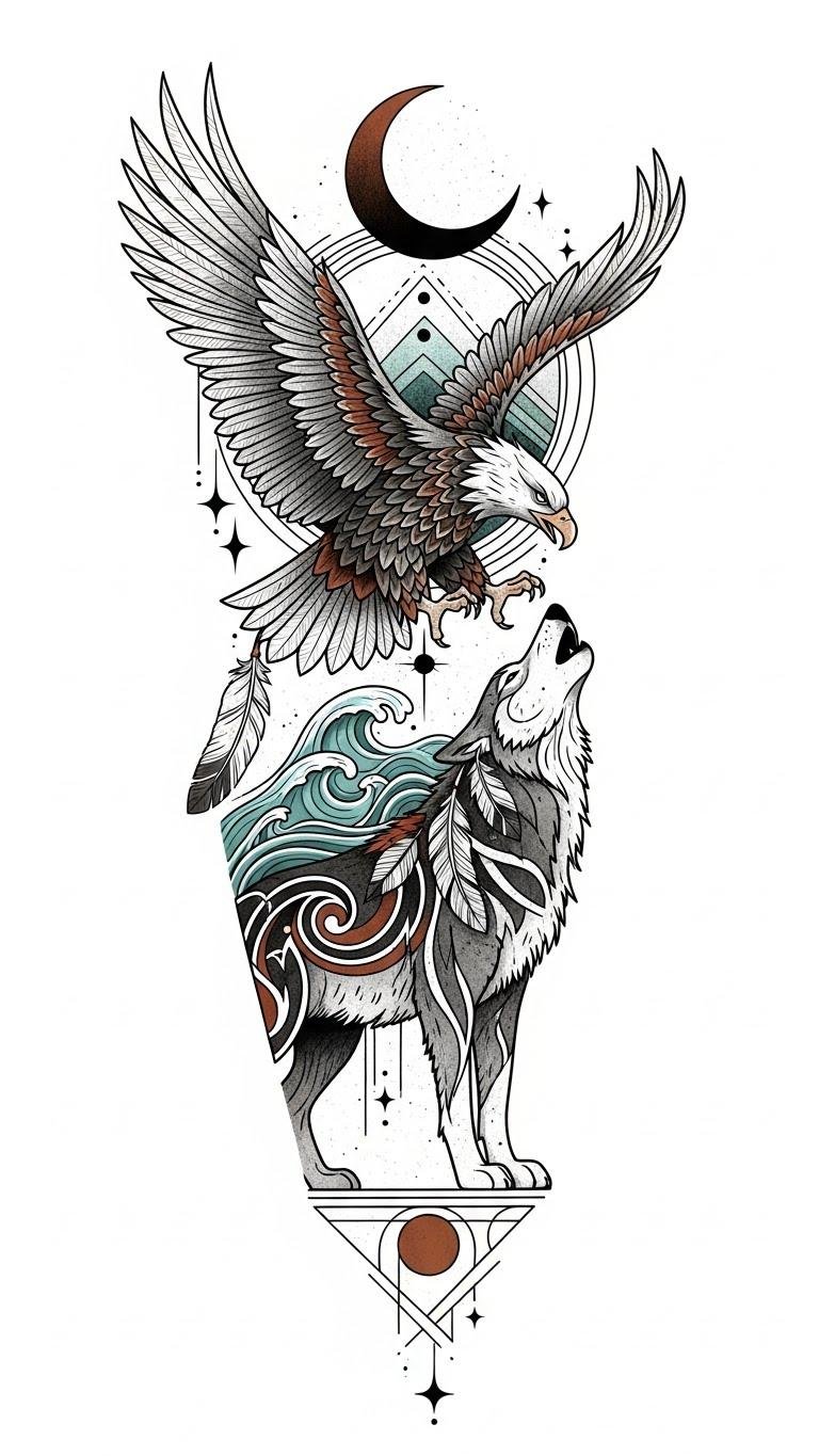 By choosing such tattoos, you express your reverence for the wild, embracing freedom and the journey of life intertwined with nature’s beauty. The eagle symbolizes vision and spiritual ascent while the wolf evokes loyalty, instinct, and communal bonds; the crescent moon and stars connect the wearer to cyclical time and the wider universe.