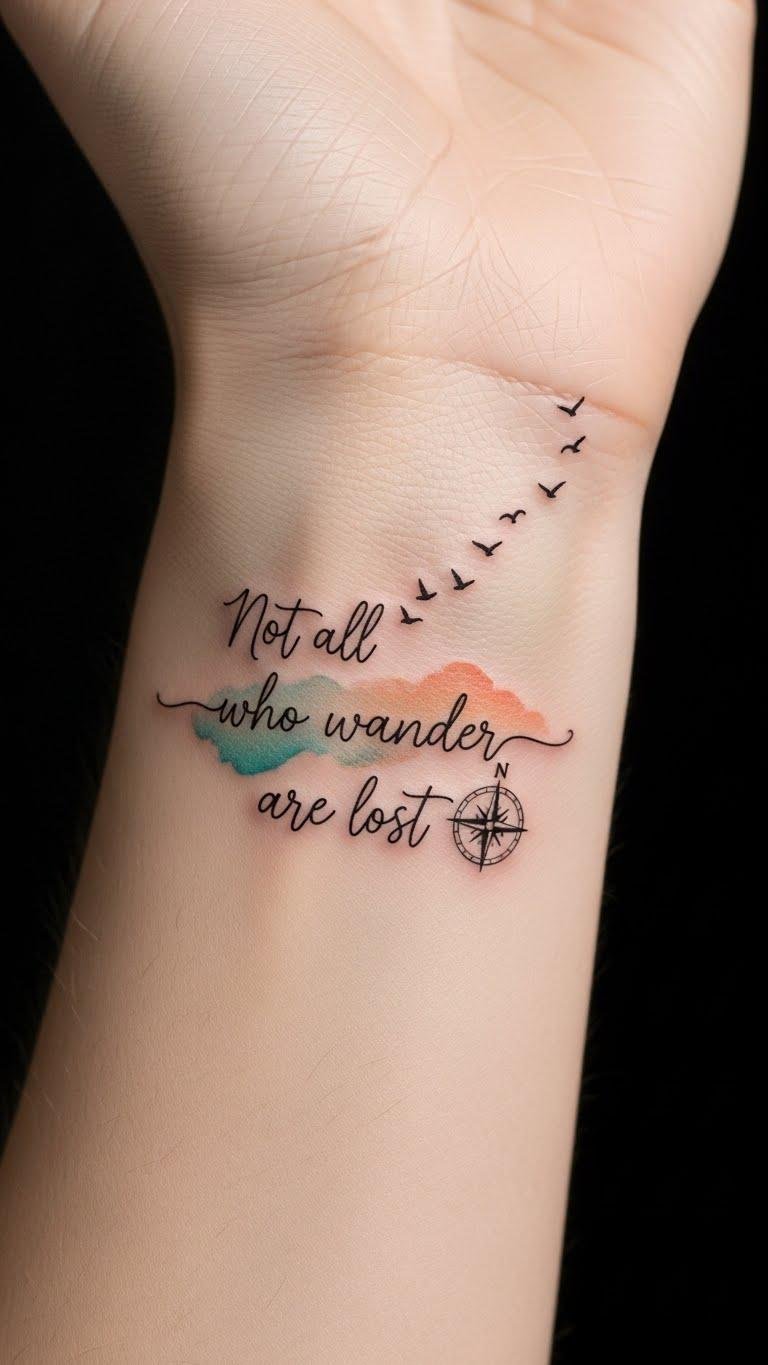 This wrist placement keeps the design intimate and visible, the compass symbolizing guidance and the birds representing liberated movement; the watercolor wash adds warmth and nostalgia, evoking sunsets and sea breezes while the handwritten script feels personal and reassuring — a daily emotional anchor for exploration.