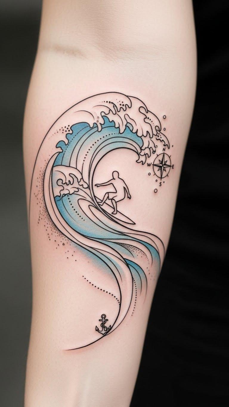 Whether featuring surfing motifs or nautical themes, they celebrate your journey, inviting you to embrace each crest and trough as a symbol of your freedom and resilience. This design emphasizes continuity and movement—symbolizing resilience and adaptability—evoking calm confidence and adventurous spirit; emotional resonance is conveyed through the gentle blue wash and minimalist line, making it ideal for the forearm or calf where its wrap and motion can be seen and felt.