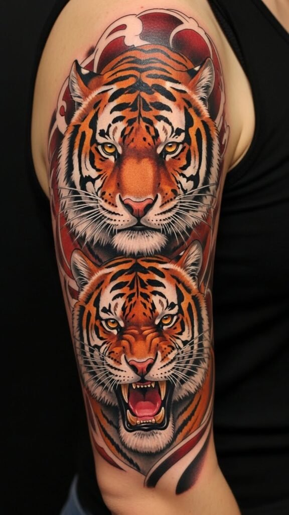 When you think of power and elegance combined, fierce tiger tattoos often come to mind, representing strength, courage, and ferocity. These fierce designs capture the spirit of the wild, showcasing powerful imagery that resonates with your desire for freedom. With vibrant colors, each tattoo tells a story of resilience, making it a perfect choice for anyone wanting to express their inner strength. This design envisions a dynamic mid-sized tiger rearing on a rocky outcrop, muscles rippling and eyes focused, rendered in saturated oranges and deep blacks with teal accents; background elements include wind-swept bamboo and subtle watercolor splashes to convey movement and freedom. Symbolically it merges raw power and poised elegance—courage to face challenges, resilience through trials, and the pursuit of personal liberty—evoking pride and fierce protection; ideal placements are the upper arm wrapping around the bicep, the shoulder blade spreading across the back, or the calf where the tiger’s stance follows natural muscle lines, allowing the colors and details to accent body contours.