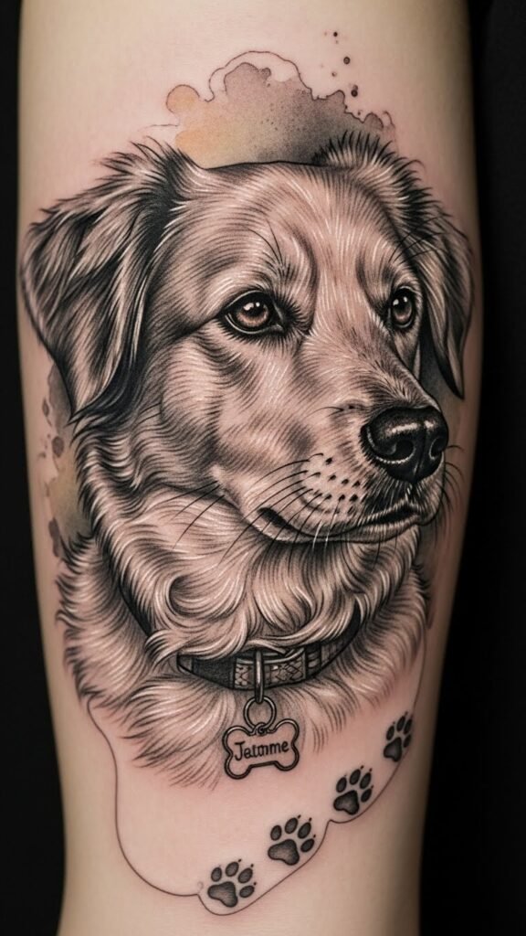 Place this design on the upper forearm to allow visibility and intimacy; the realistic rendering conveys deep emotional connection and remembrance. The watercolor wash suggests memory and freedom, and the name-tag detail personalizes the tribute while the paw trail evokes journey and lasting loyalty.