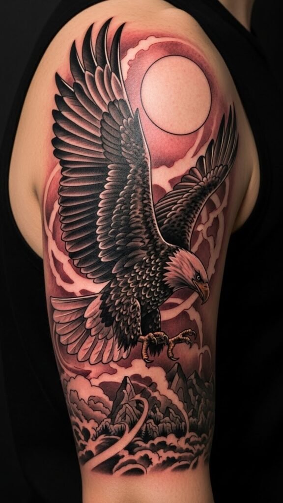 Majestic and powerful, the soaring eagle tattoo embodies freedom and strength, serving as a stunning tribute to nature’s most revered bird. With its eagle symbolism, this ink design captures the essence of soaring high above limitations. Each detail reflects your desire for liberty, making it a perfect freedom representation. Embrace this striking artwork to inspire a life of adventure and unyielding spirit. The design combines bold linework and dynamic wing motion to evoke uplift and resilience; ideal placement is across the upper back or chest for a commanding presence, or along the forearm for visible daily motivation. Symbolically it represents liberation, courage, and transcendence, while emotionally it conveys determination, empowerment, and a call to explore beyond boundaries.