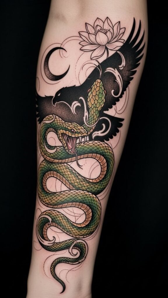 This design blends the tension between air and earth—eagle and serpent—evoking protection, transformation, and renewal; emotionally it reads as resilient and introspective, ideal for a forearm wrap or along the ribcage where movement enhances meaning and the composition can curve naturally with the body.