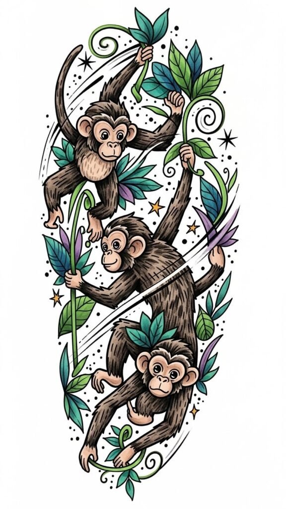 Imagine vibrant designs capturing playful monkey antics swinging through lush, whimsical jungle scenes. These tattoos embody freedom and joy, inviting a sense of adventure wherever you go.