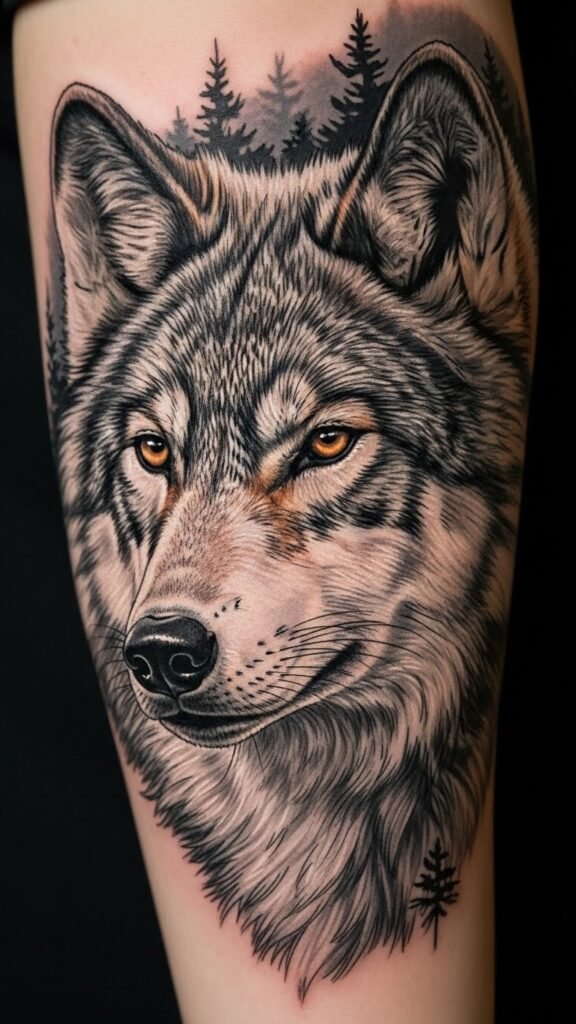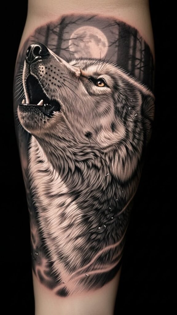 This wolf design symbolizes intuition, loyalty, and inner strength; its moonlit reflection evokes solitude and guidance. Ideal for the forearm or calf to allow the wrap-around detail to flow with muscle contours, it conveys raw emotion while remaining elegant and personal.