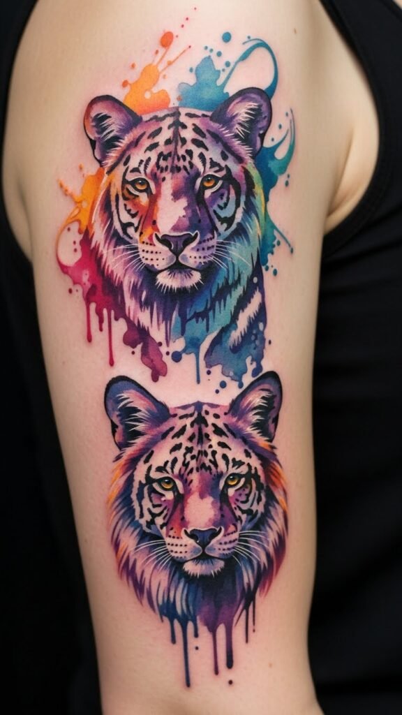 This design emphasizes bold emotion—confidence, resilience, and warmth—through sunset colors and dynamic pose; it works as a forearm or shoulder wrap to follow muscle lines, allowing movement and interaction with the body, while the watercolor accents soften edges for an expressive, personal statement.
