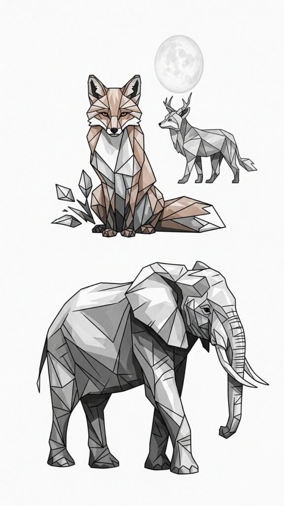 The tattoo concept merges a geometric fox and elephant in a single, balanced composition: the fox rendered in interlocking sharp-angle facets curving into the elephant’s bold, polygonal head and trunk, using negative space and thin dotwork lines to blend the two forms; limited palette of black and deep charcoal with small accent of muted copper; size adaptable from forearm strip to upper back centerpiece. Symbolically this design represents cunning and wisdom fused together, evoking resilience, independence, and guardianship; it reads as both dynamic and grounded, suited for placement on the forearm, chest near the heart, or centered on the upper back where the duality and flow can follow musculature and movement.