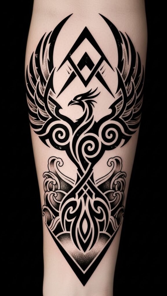 A phoenix-shaped tribal design here symbolizes rebirth, resilience, and the continuity of ancestral strength; the interlocking curves convey unity, while the geometric waves at the base signify life’s challenges transformed into momentum.