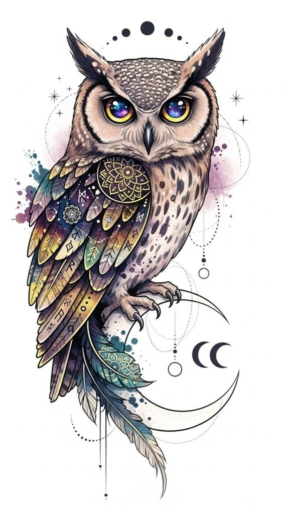 This placement emphasizes contemplation and personal meaning; the crescent moon and nebula eyes evoke mystery and guidance, the runes and mandala offer protection and balance, and the watercolor palette conveys emotion — best positioned where it can be seen during moments of reflection yet remain intimate when desired.