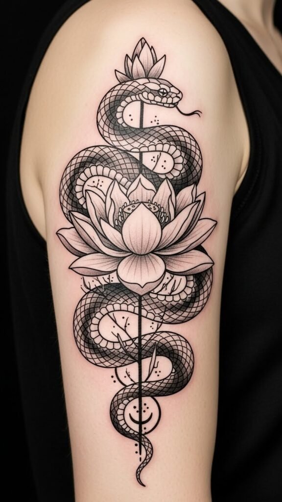 This design pairs bold, flowing linework for the snake with delicate shading and subtle color in the lotus to evoke contrast—strength and softness.