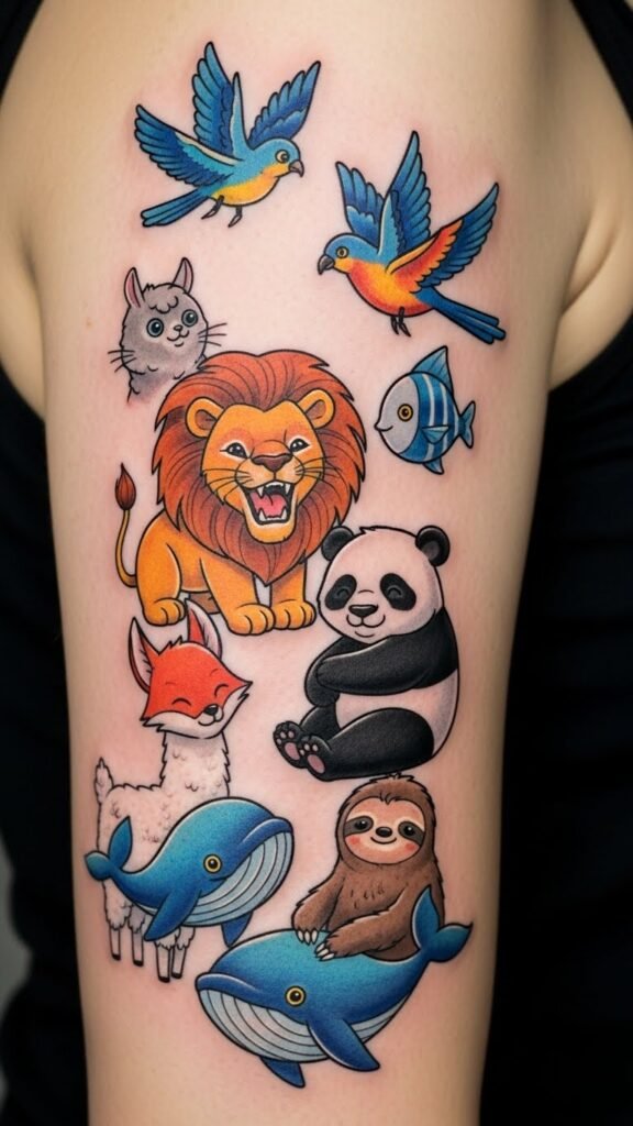 This design concept celebrates joy, individuality, and lightheartedness through brightly colored, exaggerated animal characters that radiate warmth and humor; ideal placements include forearm or calf for elongated scenes (so soaring birds or swimming whales can flow), shoulder or chest for bold focal pieces (animated lions or cuddling pandas), and wrist or ankle for small, quirky accents (quirky cats or funny fish);