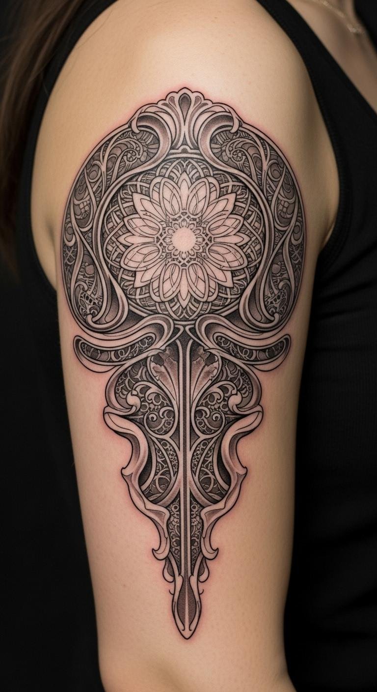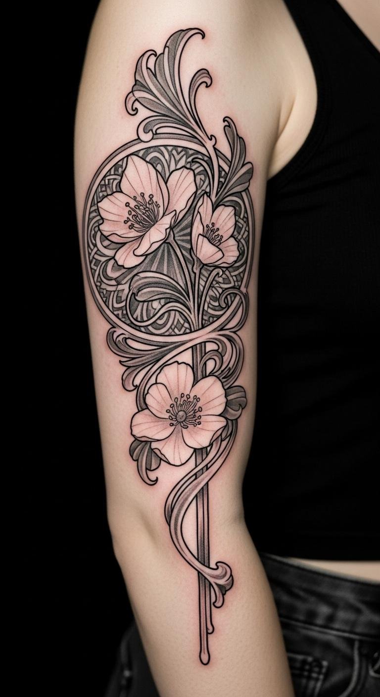 A flowing upper-arm or chest piece that translates the text’s Art Nouveau curves into a stylized composition: a central ornate blossom rendered in saturated jewel tones, framed by sinuous lines and decorative filigree, with subtle dotwork shading and fine-line highlights to modernize the motif. Symbolically the blossom and curves represent personal growth and the harmony between tradition and reinvention; the vibrant palette evokes confidence and joy, while the intricate details invite close viewing and introspection. Ideal placement wraps the design to follow musculature—upper arm, shoulder to chest, or along the rib—to emphasize movement and the wearer’s body as part of the composition.