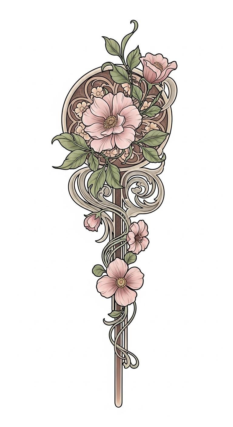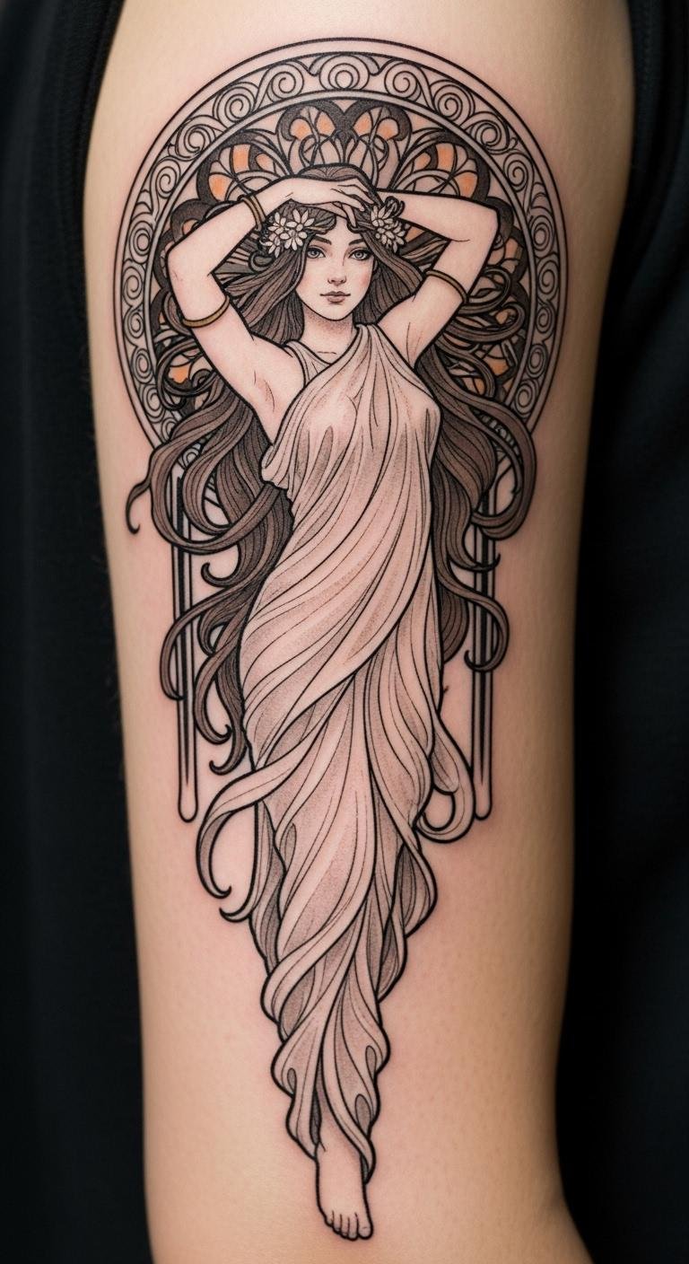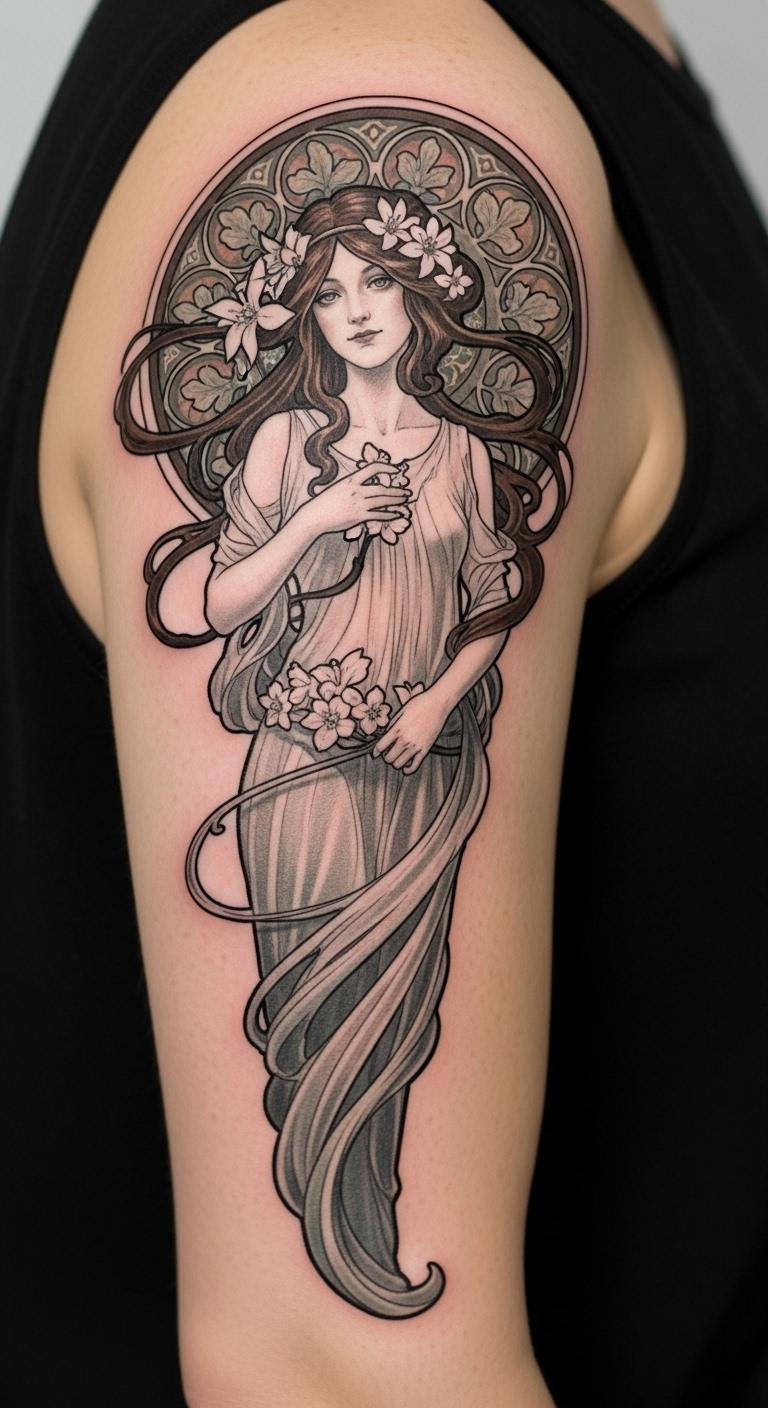 Best placed on the shoulder extending into the upper sleeve, the composition uses silhouette emphasis and negative space to read clearly from a distance yet reveal detail up close, allowing the wearer’s connection to nature and Art Nouveau aesthetics to be both personal and visible.