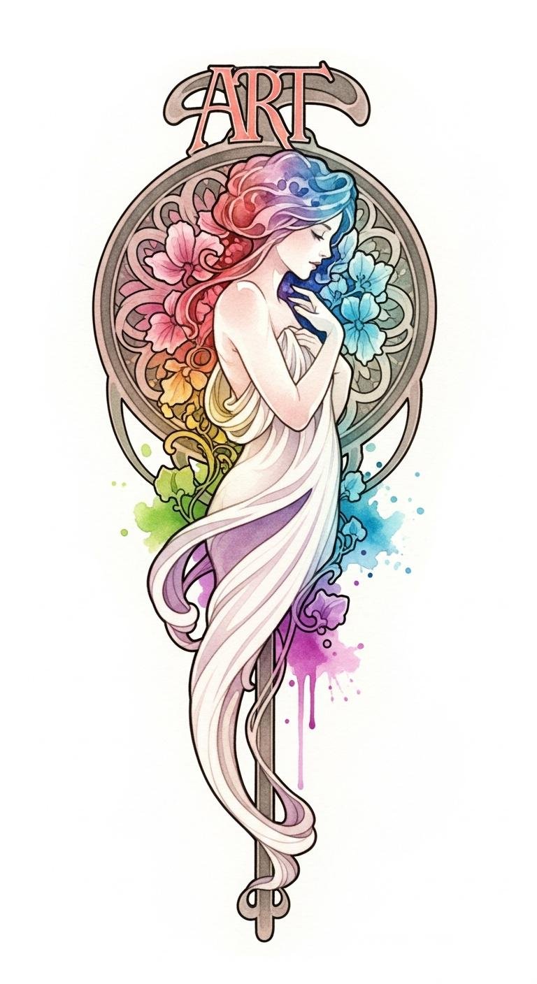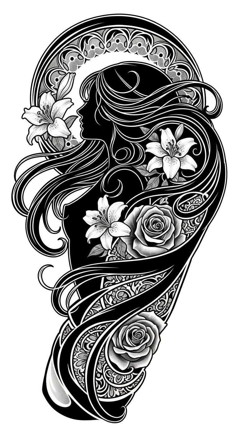 This design uses the given text as the visual and conceptual seed: an Art Nouveau composition centered on an ethereal female figure rendered with flowing hair and sinuous lines, entwined with botanical motifs—lilies, ivy, and tendrils—plus subtle decorative whiplash curves and muted earth-tone watercolor shading. Symbolically it celebrates feminine grace and the unity of womanhood with nature, evoking freedom, individuality, and romantic introspection; emotionally it reads as serene and empowering. Ideal placement: upper arm wrap, ribcage, or full-back panel where the flowing lines can follow the body’s contours and allow the intricate details to breathe.